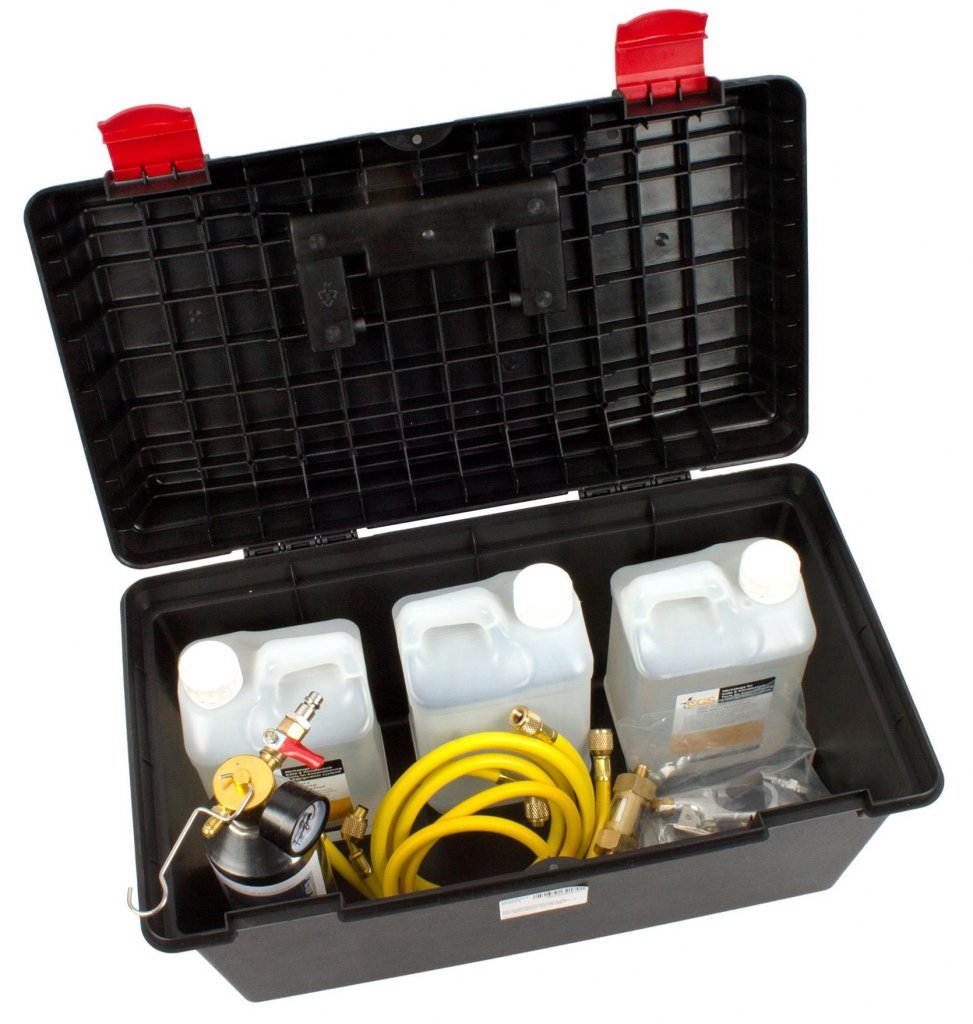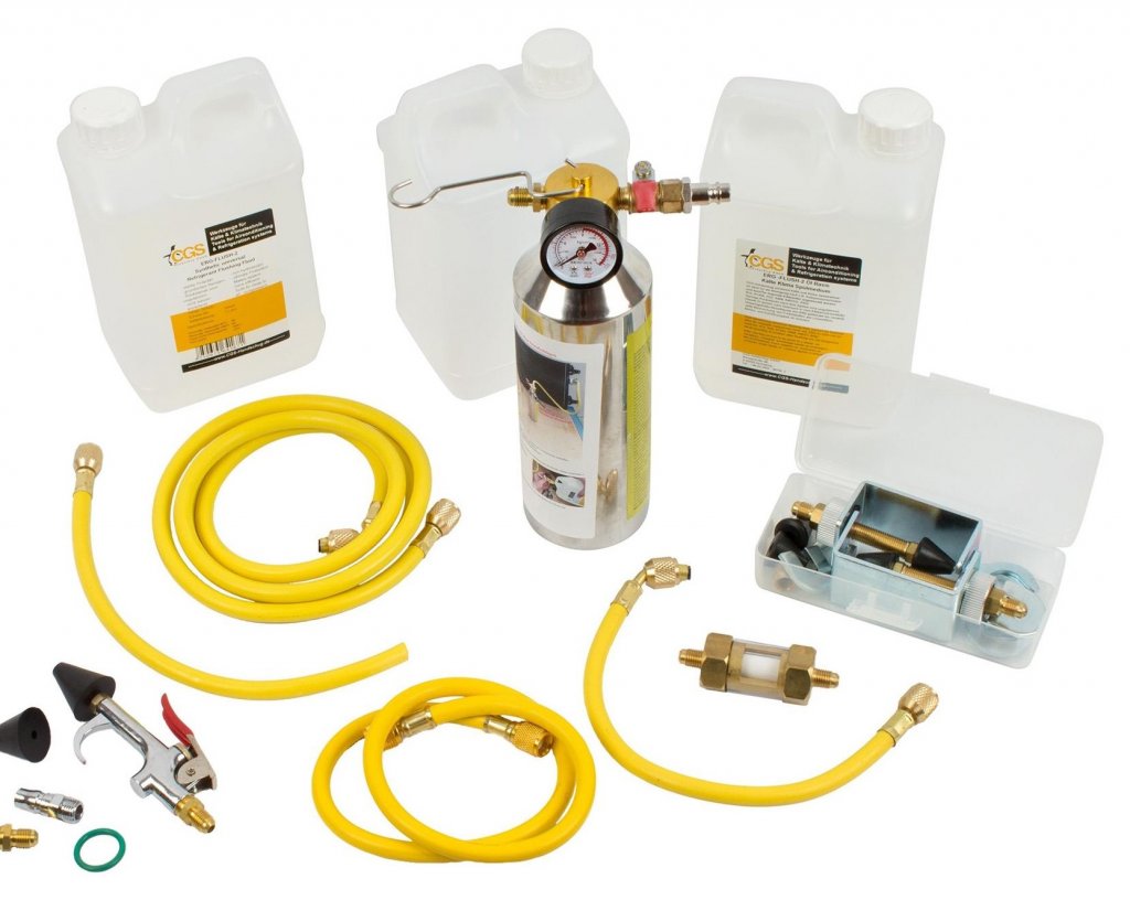Detta AC-spol- & rengöringsset är ett komplett verktyg för professionell rengöring och spolning av luftkonditioneringssystem, särskilt vid kompressorskador, systemhaverier eller långvariga läckor. Noggrann rengöring av rör och komponenter rekommenderas av tillverkare av AC-kompressorer, särskilt vid garantihantering vid tidiga fel.