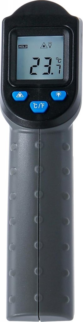 Termometern använder en infraröd laser som riktas mot objektet för att registrera den utstrålade energin. Temperaturen visas direkt på den tydliga LCD-displayen för snabb avläsning. Med ett förinställt emissivitetsvärde på 0,95 fungerar den på de flesta organiska material, lackerade ytor och oxiderade metaller – helt utan krångliga inställningar.