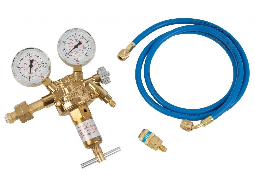Enligt lagstiftningen är det obligatoriskt att kontrollera läckor innan ett tomt AC-system fylls. Setet innehåller en högkvalitativ tryckreducerare ansluten till en formgasflaska fylld med 95 % kväve och 5 % väte, vid ett tryck på 5–20 bar, vilket rekommenderas av tillverkaren. Den låga andelen väte (5 %) gör testet säkert samtidigt som elektriska läckagedetektorer kan registrera gasen, vilket gör detta test mer effektivt än rent kväve.