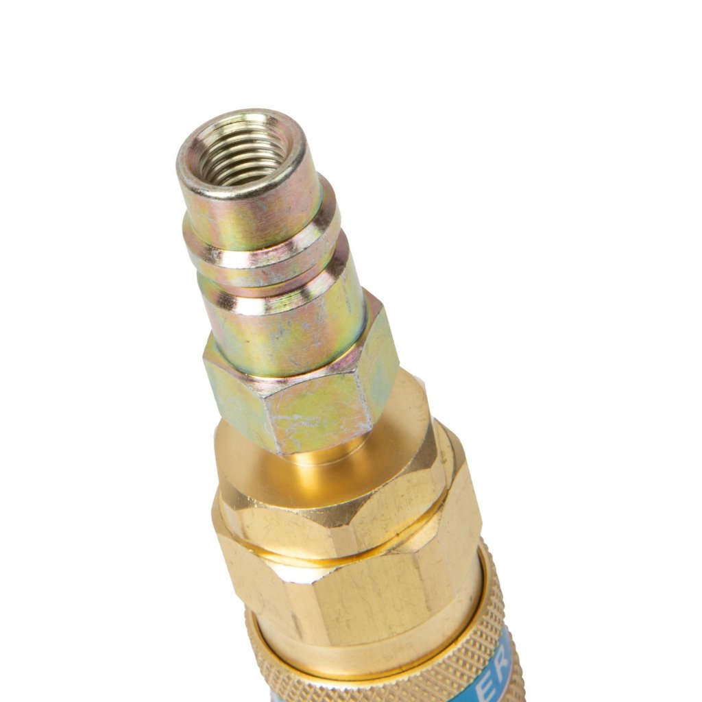 Denna snabbkopplingsadapter för luftkonditionering gör det möjligt att ansluta ett R134a-AC-system till utrustning eller servicestationer avsedda för R1234YF. Tack vare den raka konstruktionen och den integrerade ventilen blir arbetet både smidigt och säkert.