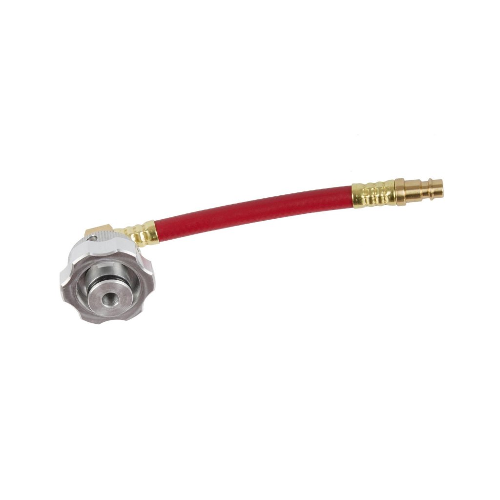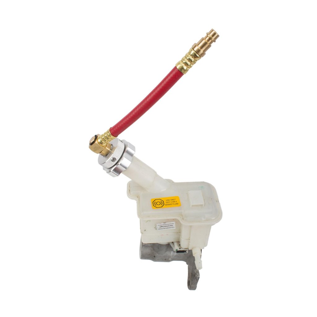 Den justerbara tätningsringen gör det möjligt att anpassa bajonettlåset genom att vrida på den räfflade fästskruven. Detta säkerställer en perfekt tätning mot bromsvätskebehållaren oavsett modell. Adaptern är utrustad med snabbkoppling DN 7.2 som kopplas till bromsavluftaren, vilket gör bromsavluftningen snabb och effektiv.