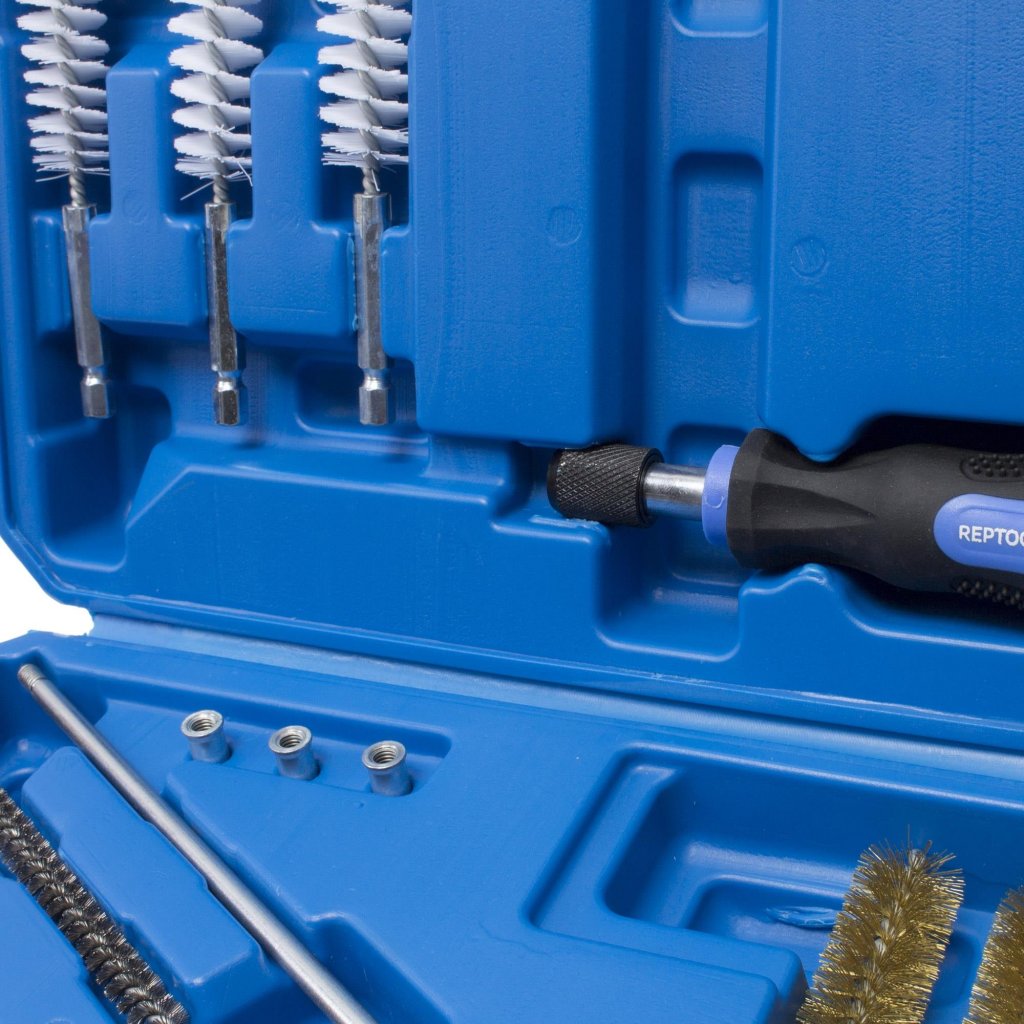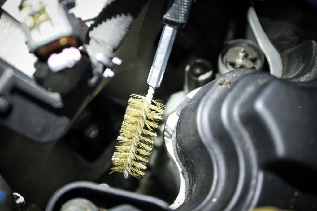 De mässingsbelagda stålborstarna tar effektivt bort förbränningsrester från injektorhusets axlar, medan nylonborstarna används för att slipa tätningsytorna utan att skada materialet. För att ge injektorsätet en jämn och slät finish används silikonnylonborstar.