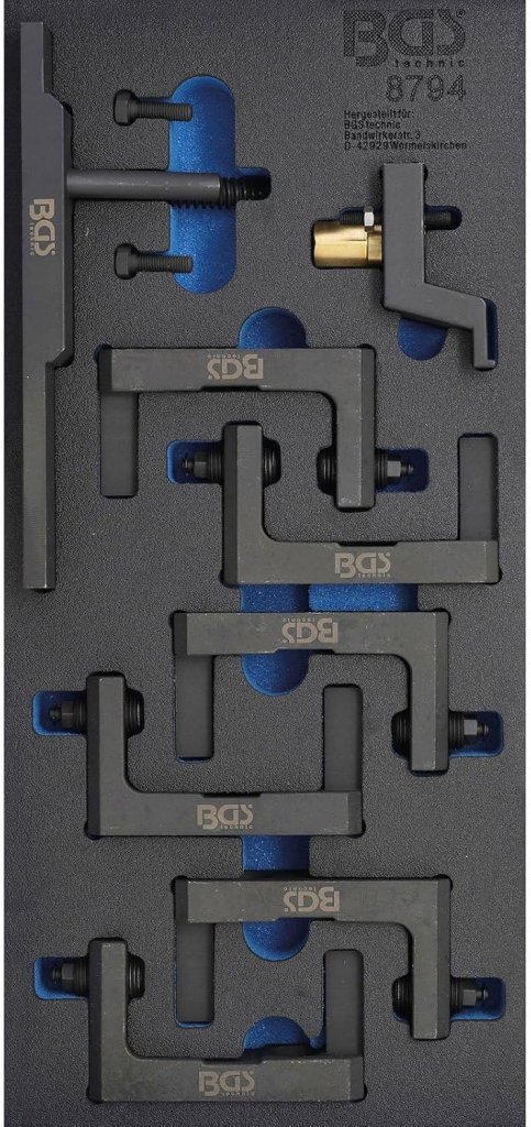Detta kamaxel-verktyg är ett specialverktyg designat för montering av avgaskamaxelns lagerlist vid kamaxelbyte på BMW N51 och N52-motorer. Verktyget används i kombination med BMW:s motorinställningsverktyg för kamkedja och säkerställer exakt positionering och säker montering.