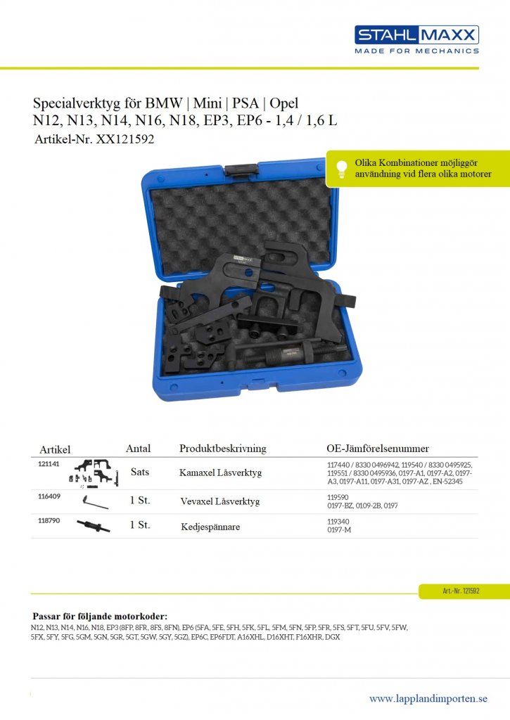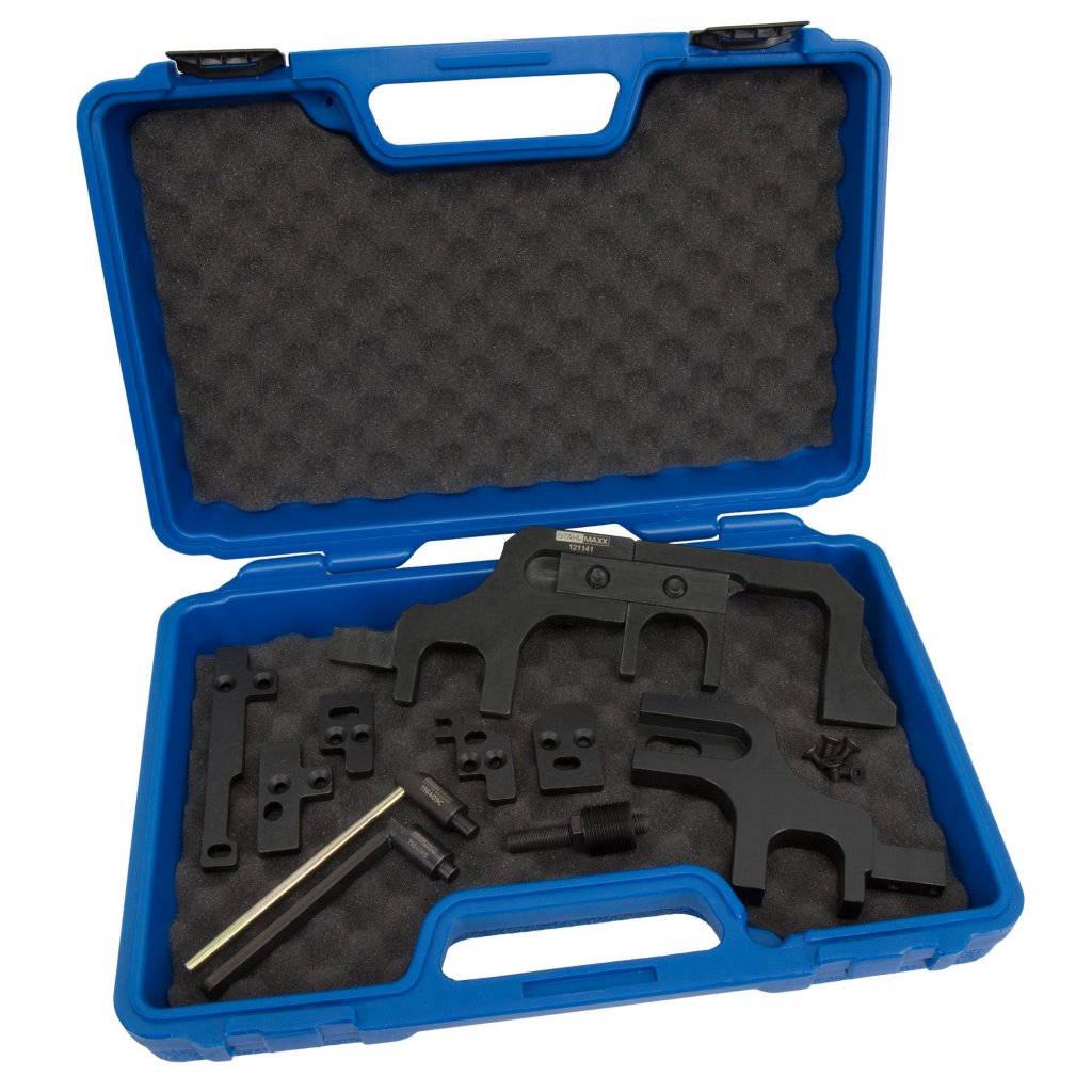 Med detta specialverktygsset, som inkluderar verktyg för att förspänna och justera kamaxel, vevaxel och kamkedja, kan du täcka ett brett urval av 1,4- och 1,6-litersmotorer från BMW, Mini, Citroën, Opel och Peugeot.