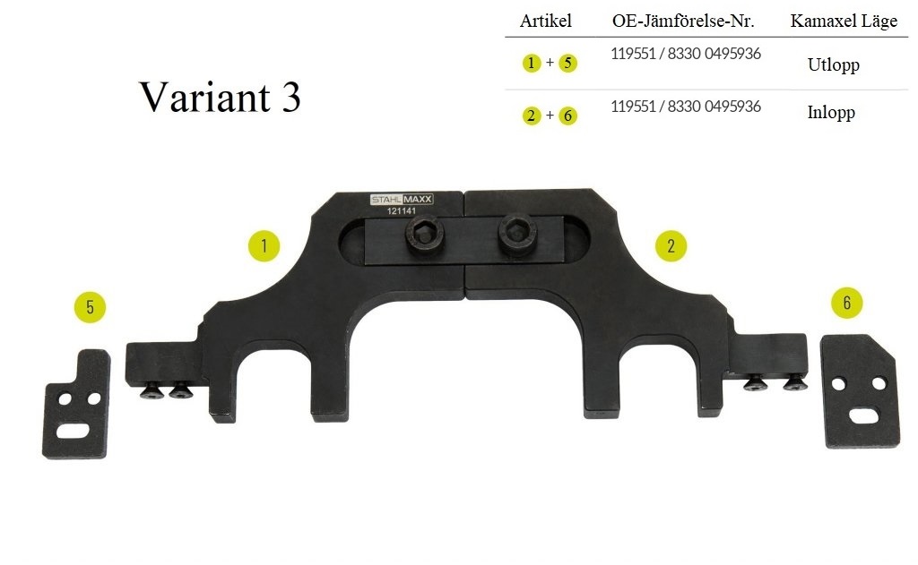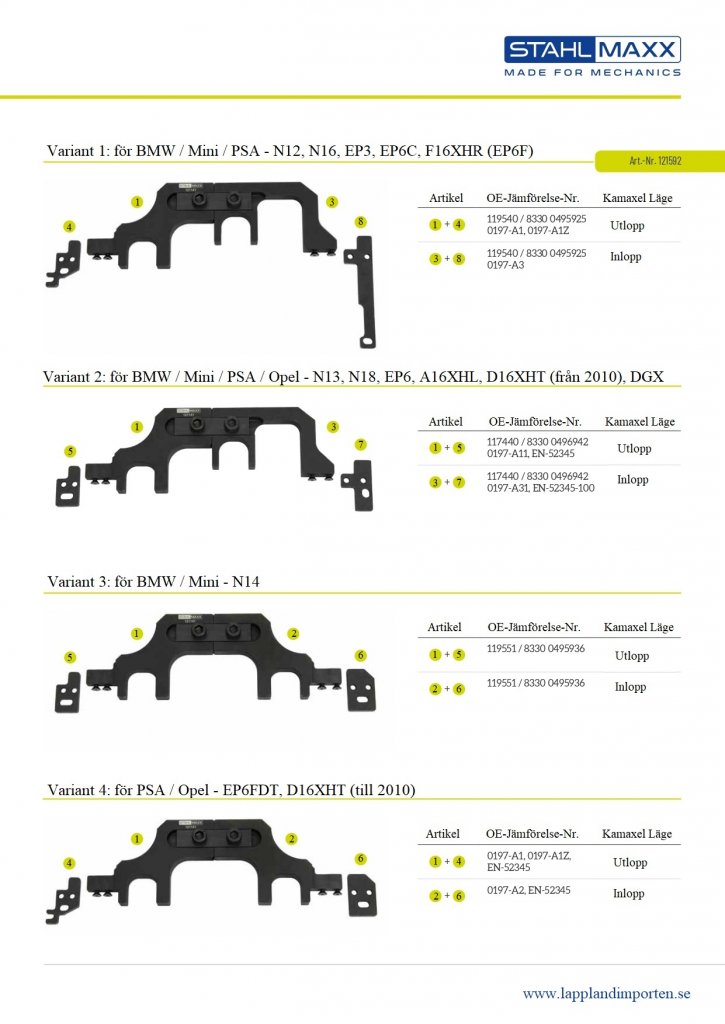 På grund av en ändring i turbolägets position har även kamaxelverktyget behövt justeras i hållare och position. Eftersom insugskamaxlarna på motorvarianterna N12, N13, N14, N16 och N18 från BMW/Mini samt EP3 och EP6 från Citroën och Peugeot är identiska, har vi sammanställt specialverktygen i ett enda set. Verktyget för förspänning av kamkedjan i detta set är kompatibelt med alla dessa varianter.