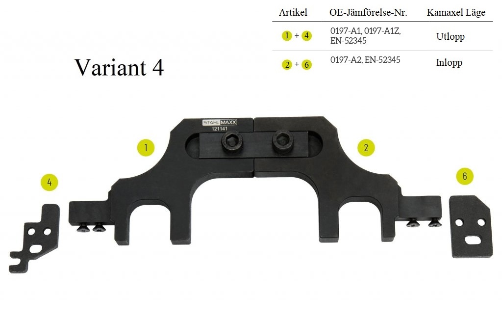 För snabb och enkel kombination av rätt komponenter baserat på motorkod, se monteringsanvisningen som finns för nedladdning i vår webbshop. I vissa reparationer används ett inklinometer/vinkelmätare för att kontrollera kamaxelns vinkel mot topplocket. Detta kan även göras med en standard vinkelhake eller genom att återinföra verktyget.