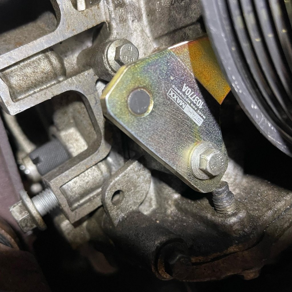 Vevaxelns remskiva har en magnetisk sensorring, som ska justeras med detta verktyg (som används som 303-1550).