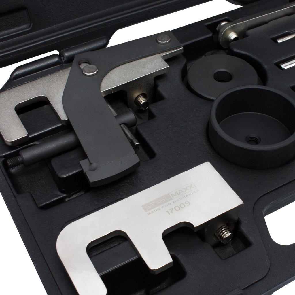 Denna verktygssats innehåller bland annat verktyg för kamaxelfixering och olika låspinnar för att utföra reparationer på motorer från fordonstillverkarna Renault, Opel och Nissan.