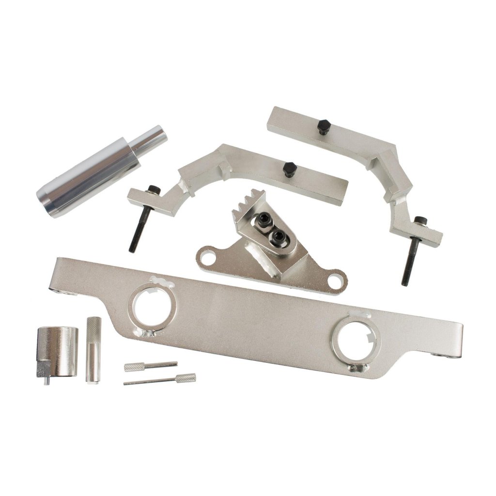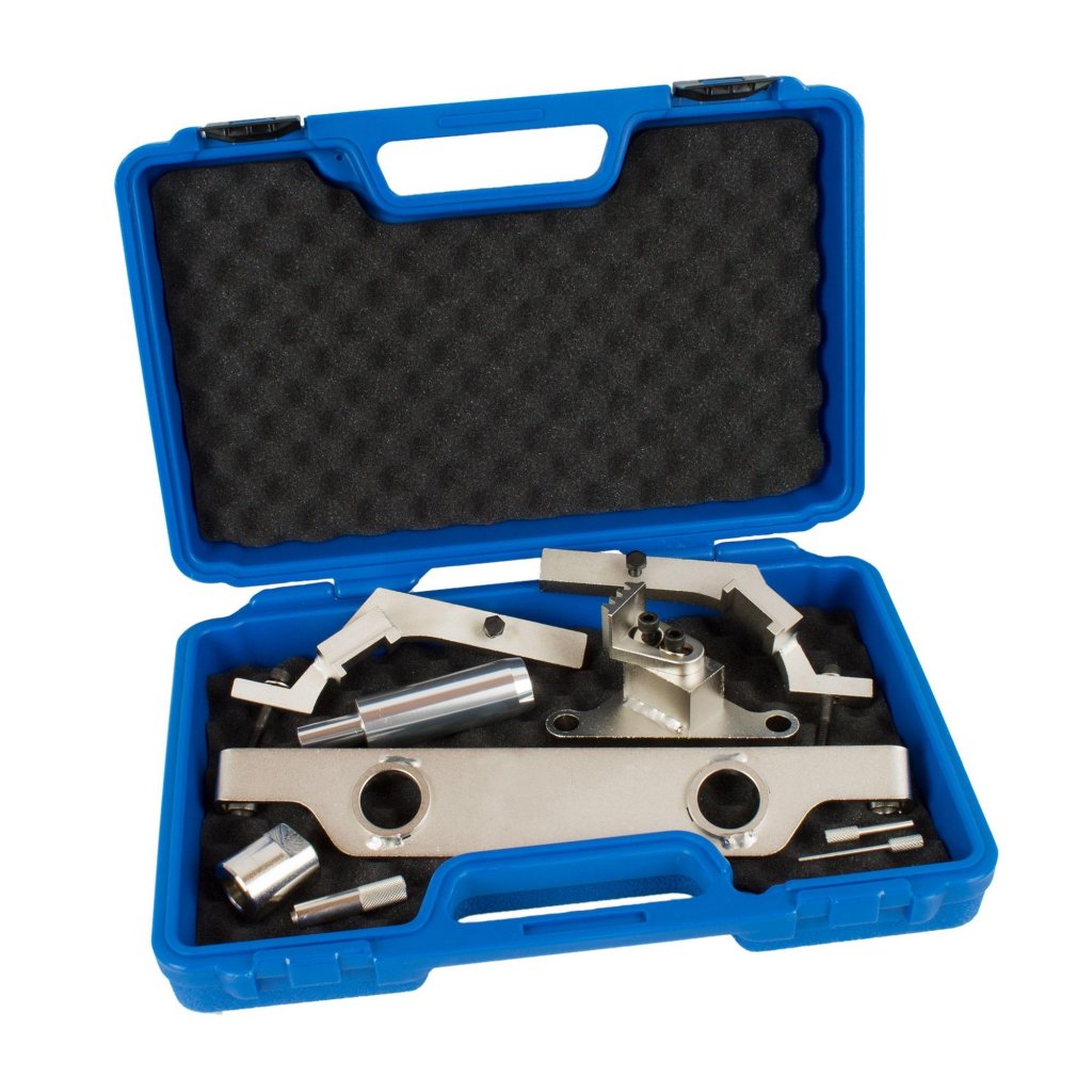 Denna sats innehåller alla verktyg som behövs för att justera och hålla kamaxeln, vevaxeln och kedjespännarens komponenter under utförande av större motorarbete eller byte av kamkedja och tillhörande delar.