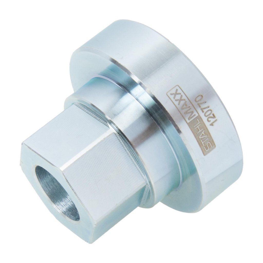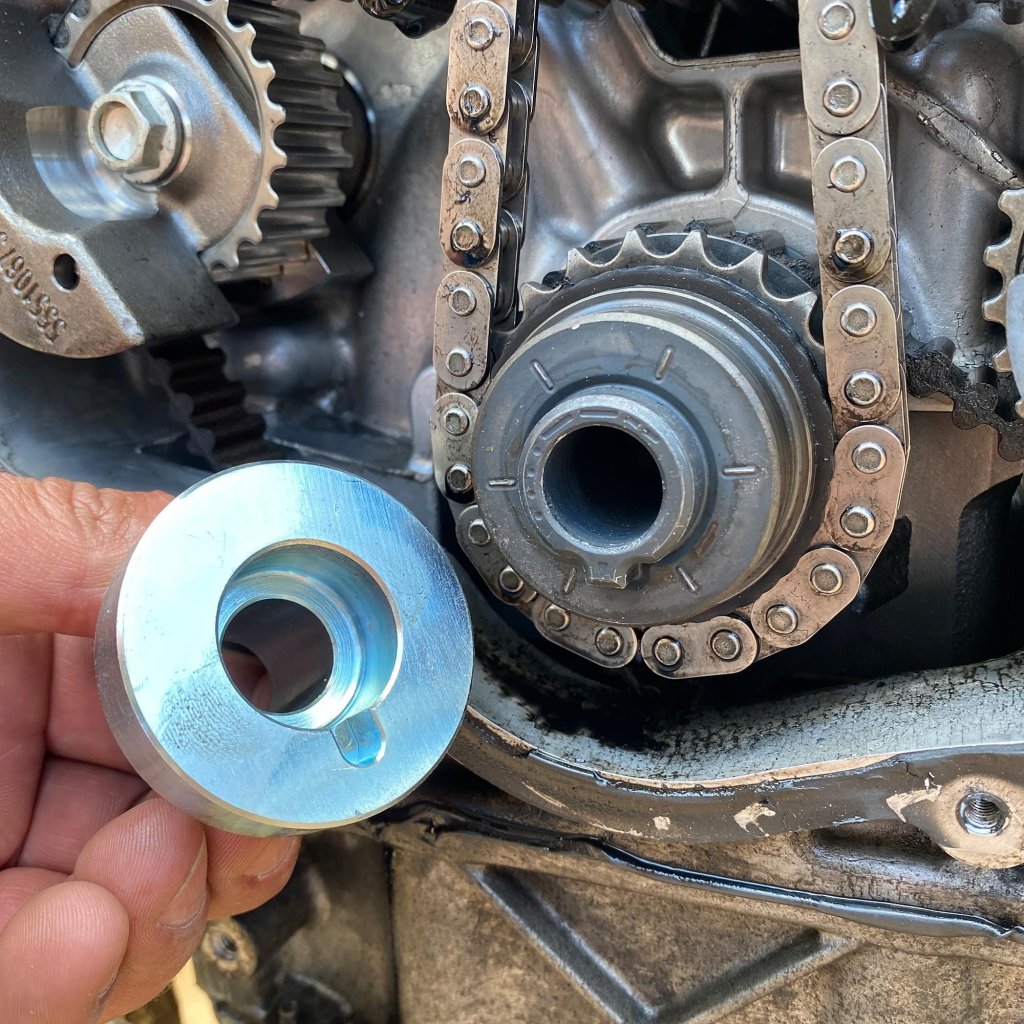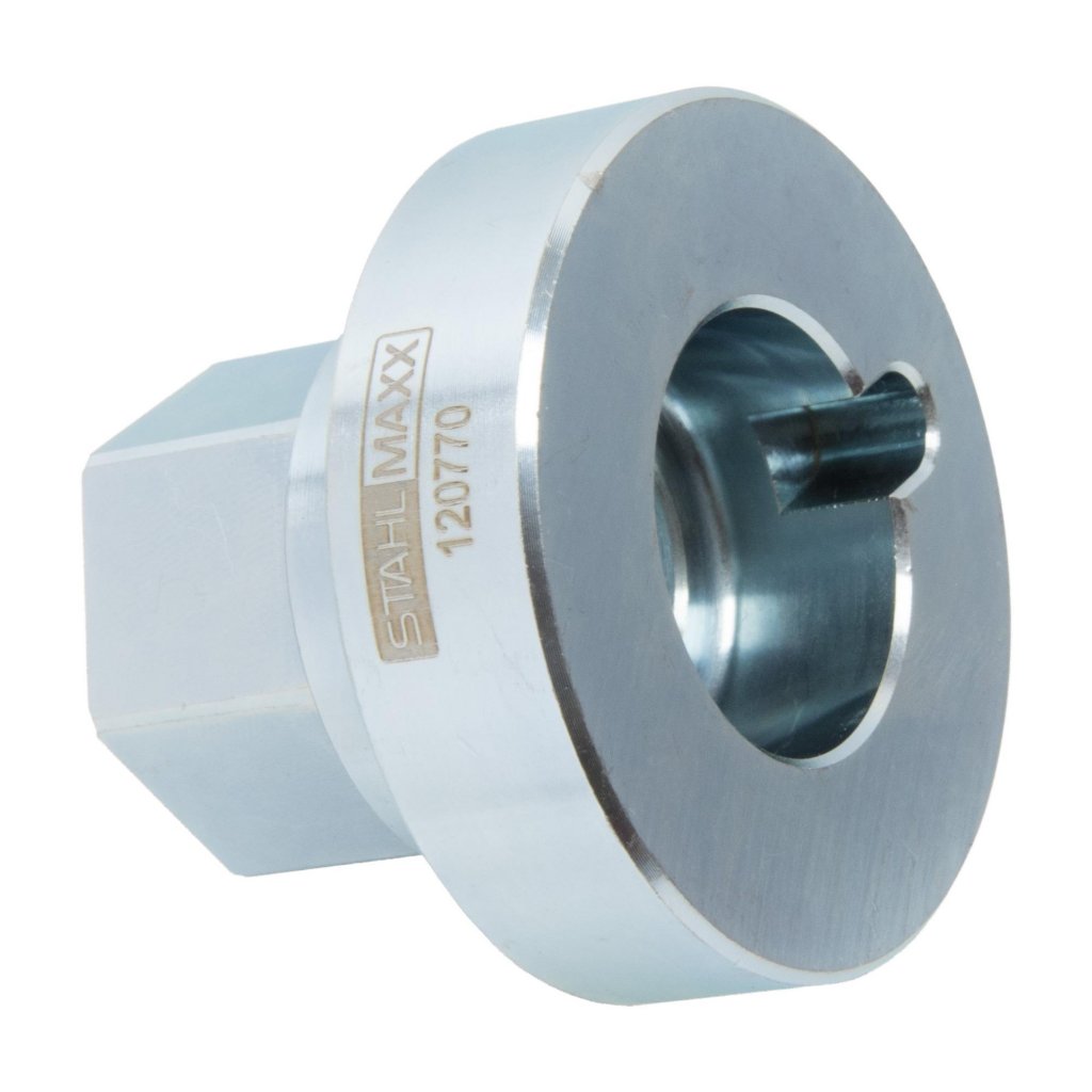 Specialverktyg för att vrida och hålla vevaxeln fästs med en central skruv och hålls mot tappen/kilen.