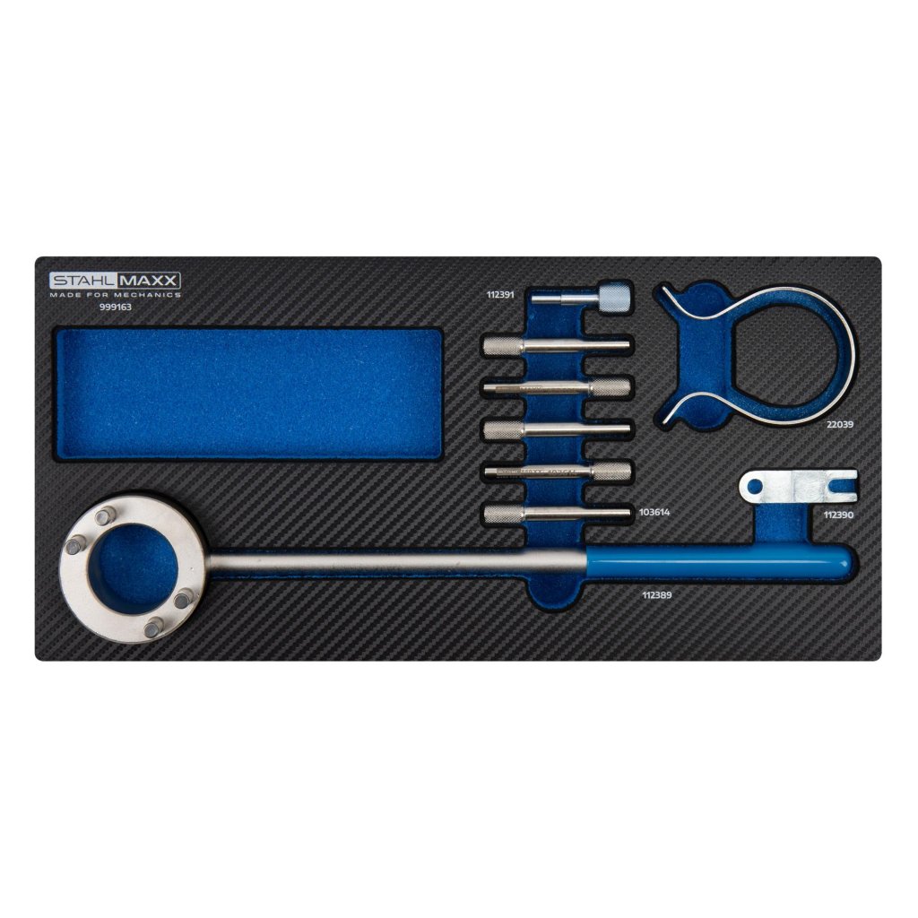 Professionell specialverktygssats för inställning och låsning av 3,0L V6-cylindriga motorer från Citroen, Peugeot, Renault, Fiat och Lancia. Alla verktyg medföljer för justering av kamremmen efter kamremsbyte eller motorreparation.