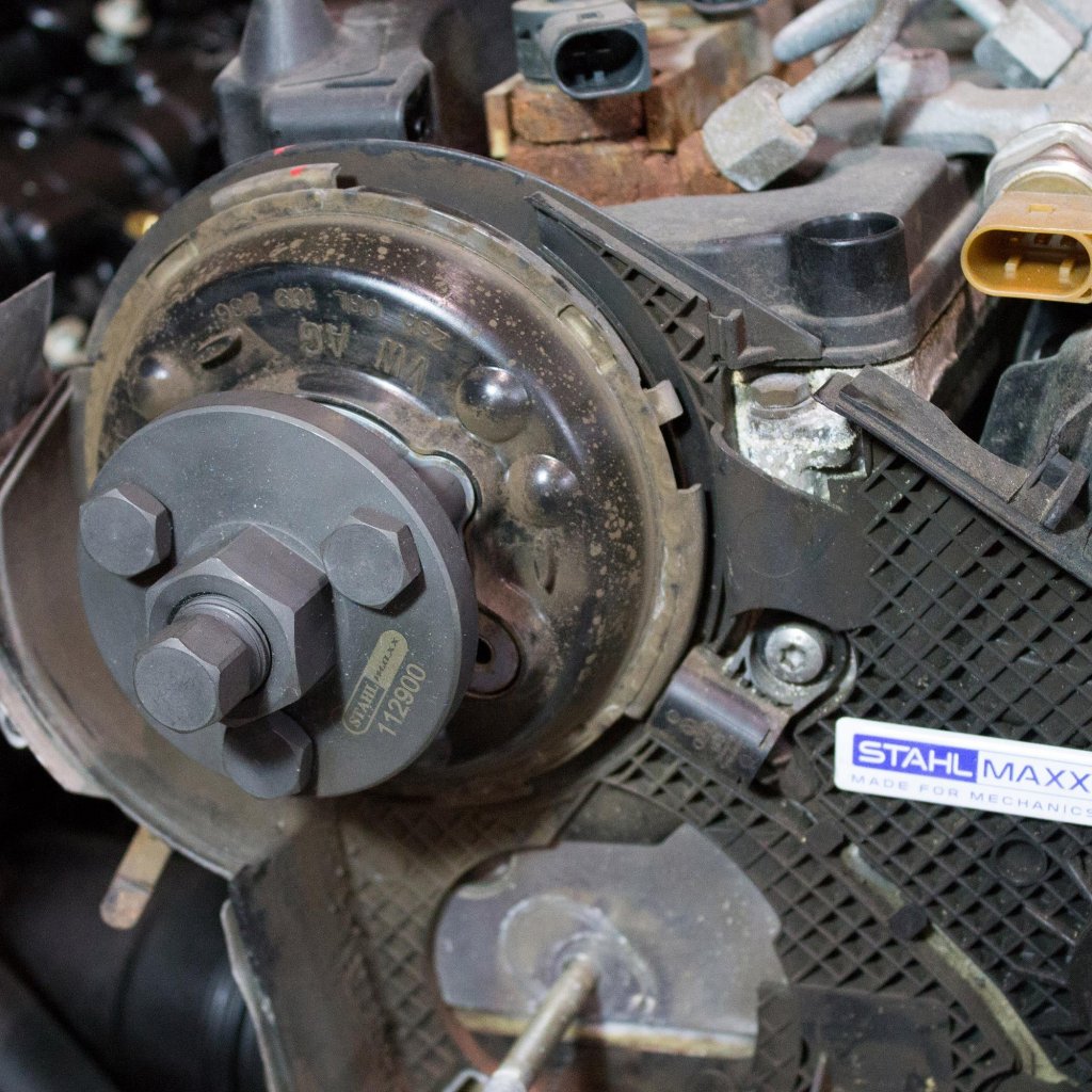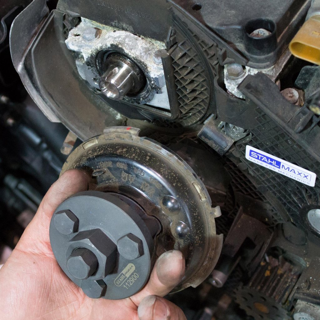 Specialverktyg för att ta bort kamaxelns kedjehjul vid motorreparationer.