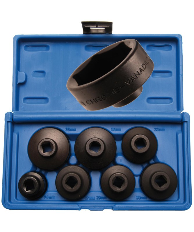 Komplett oljefilter-hylssats med 7 lågprofilerade hylsor i storlekar från Ø 24–38 mm. Perfekt för professionella verkstäder och avancerade bilentusiaster vid service av patronfilter på många bilmodeller från bland annat BMW, Mercedes, Audi, Opel, VW och fler.