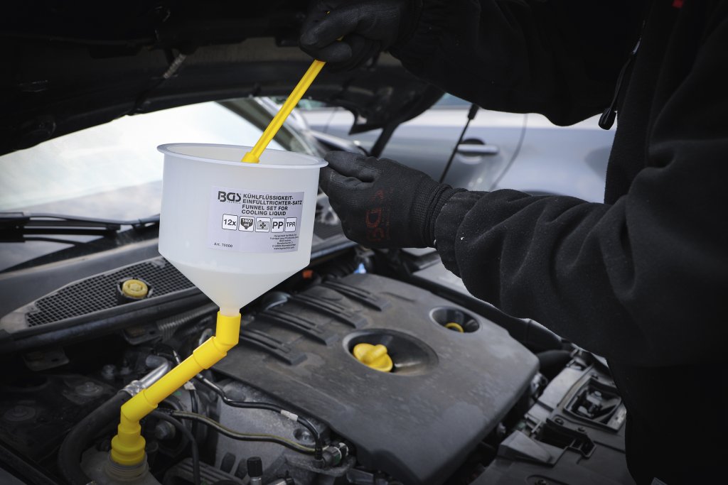 Den luftspärrande mekanismen förhindrar att luftbubblor bildas i kylsystemet, vilket säkerställer jämnt vätskeflöde och korrekt påfyllning. Tack vare den integrerade förlängaren når du enkelt även trånga och svåråtkomliga påfyllningspunkter.