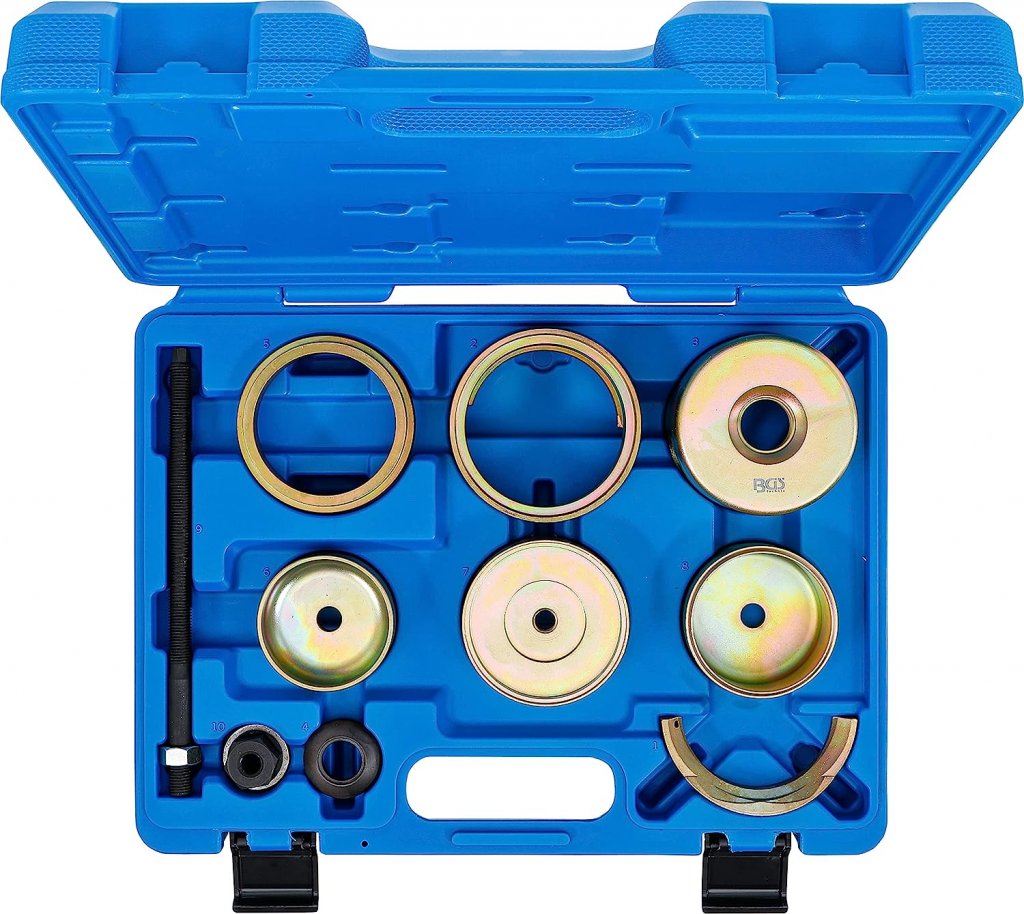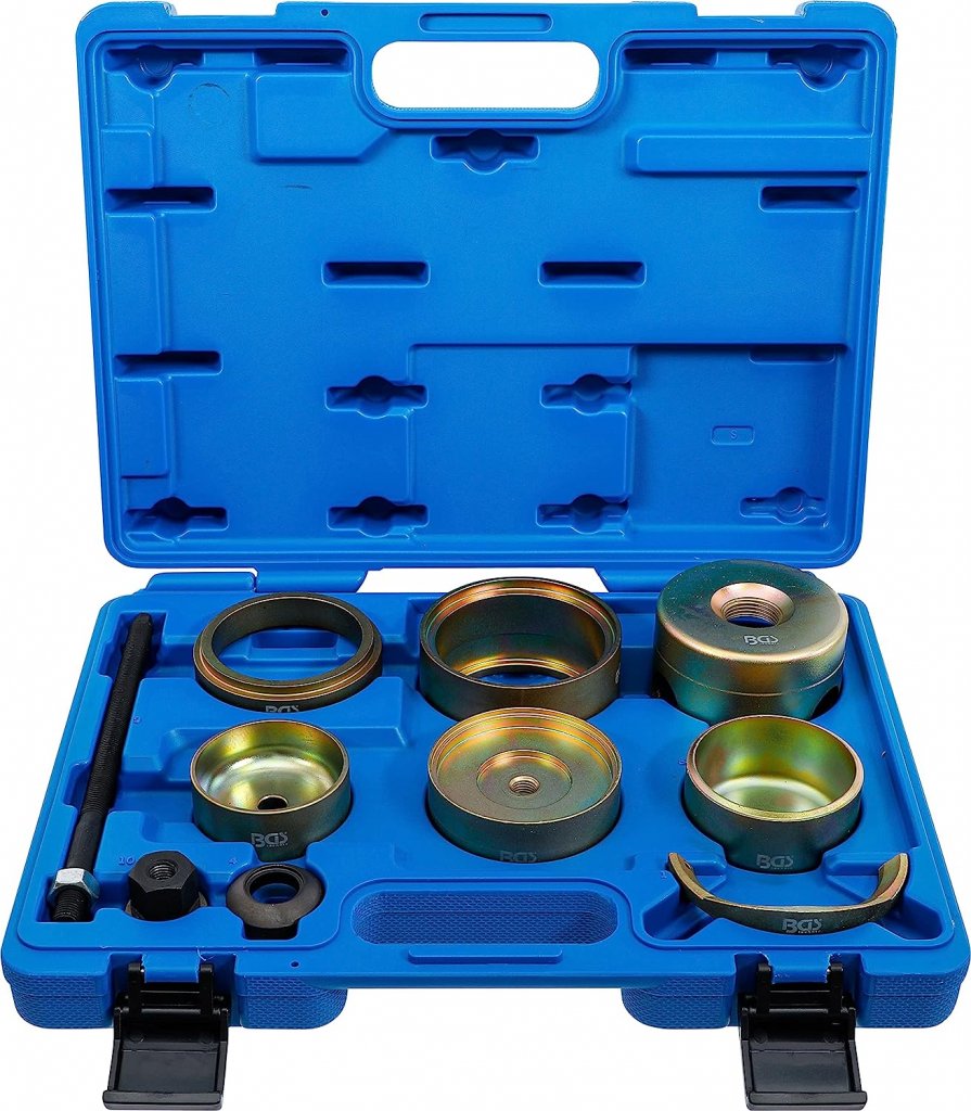 Denna kompletta silentlager-verktygssats är utvecklad för snabb och säker demontering samt montering av plast- och gummilager på bakaxeln. Arbetet kan utföras direkt på fordonet utan att bakaxeln behöver demonteras, vilket sparar både tid och arbete.