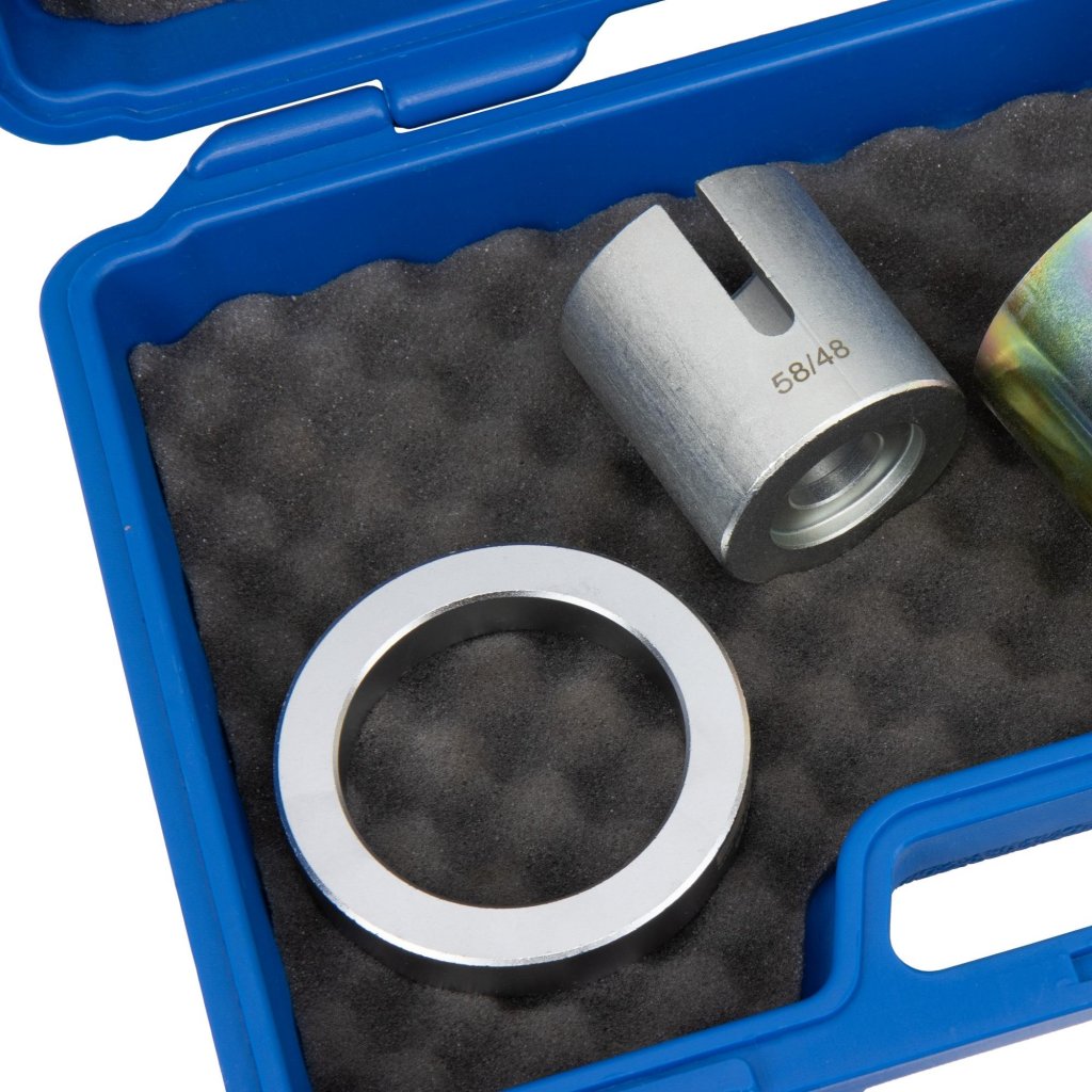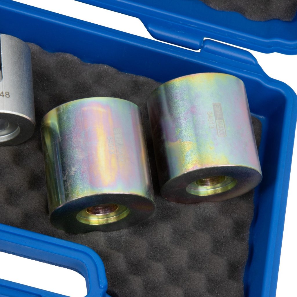 Professionell tryckstyckessats för snabb och säker demontering samt montering av länkarmbussningar på bakaxeln hos Ford- och Volvo-modeller. Verktygen är utvecklade för användning tillsammans med pressram XX117765 eller XX117766 (säljs separat) och säkerställer ett exakt och effektivt arbetsflöde.
