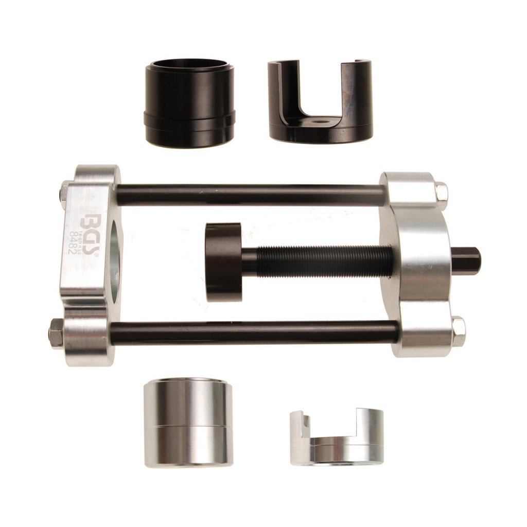 Spindelled-verktygssats för BMW E36 är ett specialutvecklat pressverktyg för demontering och montering av inpressade kulleder (hjulstyrningsleder, bussning B) som är fastskruvade i svänglagret/hjullagerhuset. Verktygssatsen är konstruerad enligt BMW:s OEM-specifikationer för att säkerställa korrekt passform, hög precision och smidigt arbete.
