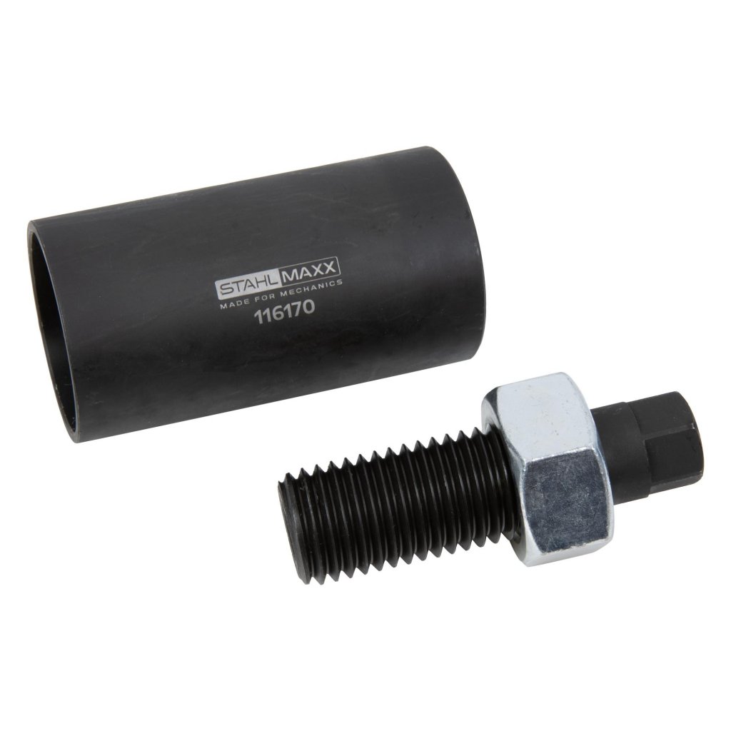 Verktyget monteras genom att skruvas fast på svängtappen. Därefter skjuts spännhylsan över kulleden och spänns med muttern, vilket effektivt pressar ut spindelleden.