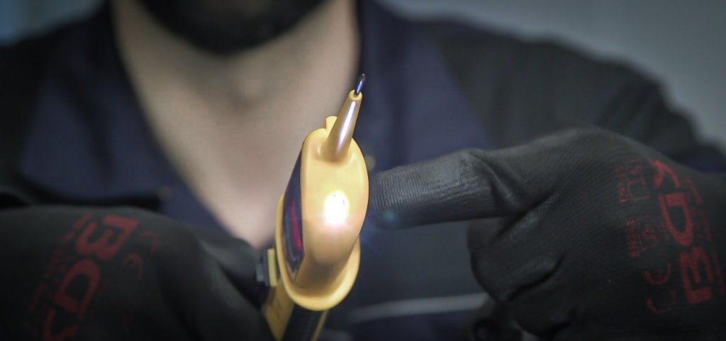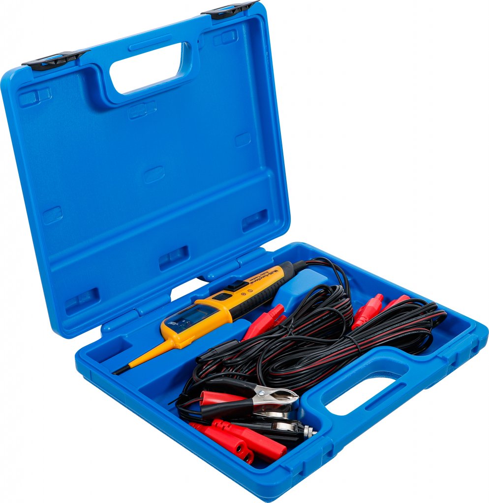 Den inbyggda LED-belysningen ger god sikt även i mörka arbetsmiljöer, och de färgkodade lysdioderna indikerar snabbt positiv eller negativ potential – idealiskt vid test av tändsystem, bränsleinsprutning och andra pulssignaler. Testaren har automatisk säkringsåterställning (max. 10 A) för säkert arbete och erbjuder dessutom beröringsfri tändningsdetektering för snabb kontroll av högspänningssystem.