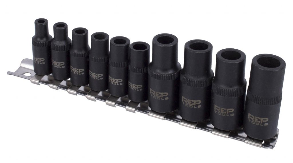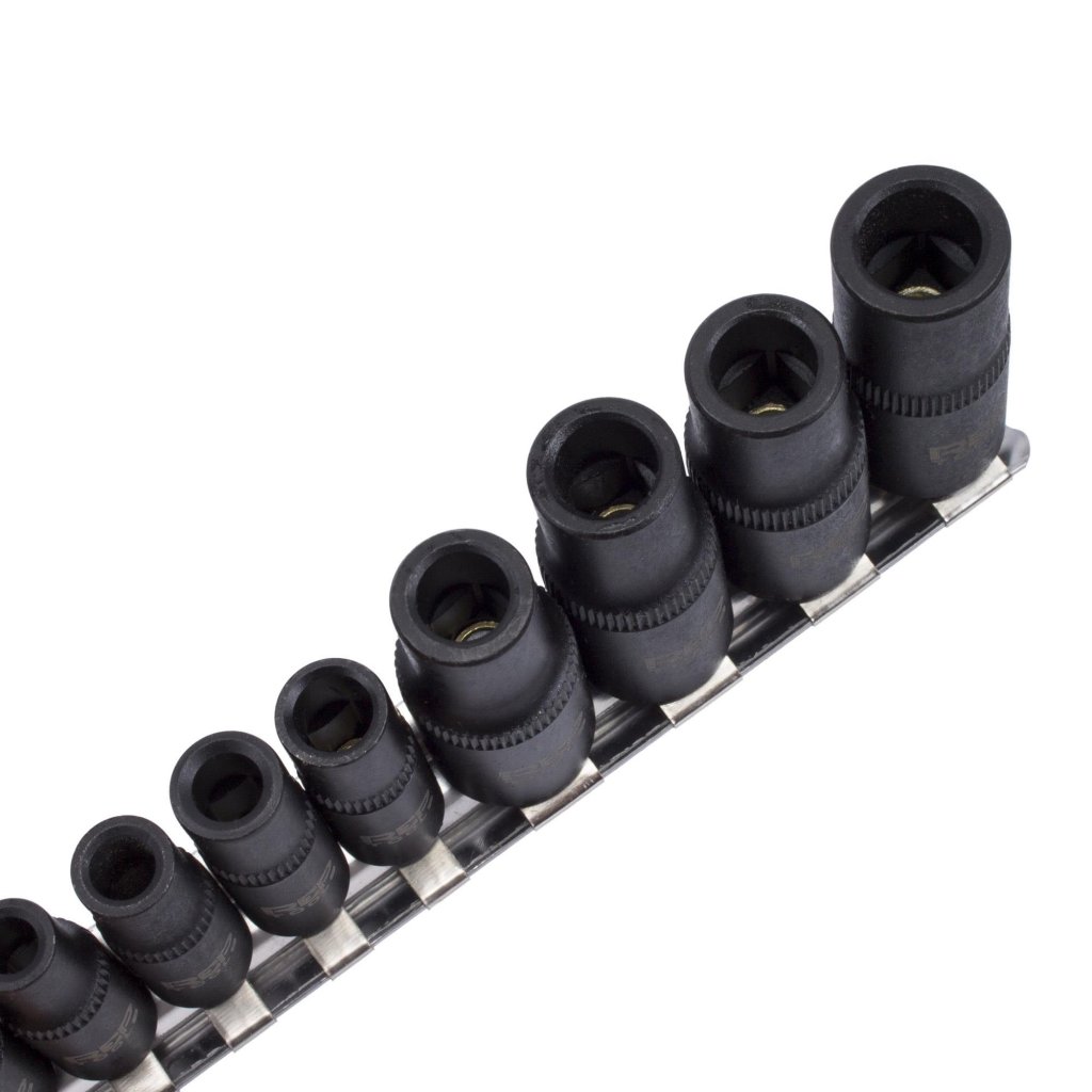 Hylsorna är tillverkade i slitstarkt Chrome Vanadium och levereras sorterade efter storlek på en praktisk metallskena, vilket förenklar förvaring och snabb åtkomst.