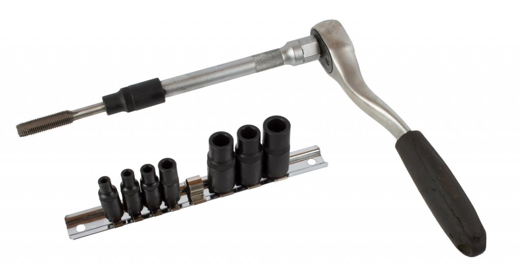 Satsen innehåller specialhylsor för fyrkant som kan manövreras med 1/4" eller 3/8" spärr, vilket ger flexibilitet i trånga utrymmen och möjliggör exakt centrering av gängtappen. Den är kompatibel med gängskärningsset art.nr. XX117900.