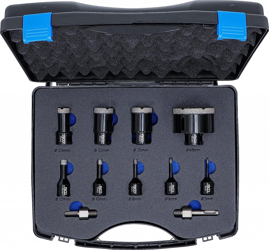 Denna diamantborrkronasats i 11 delar är framtagen för exakt och effektiv håltagning i mycket hårda material. Med dimensioner från 5 till 68 mm är satsen idealisk för installation av eluttag, rörgenomföringar, fördelardosor och andra montagearbeten.
