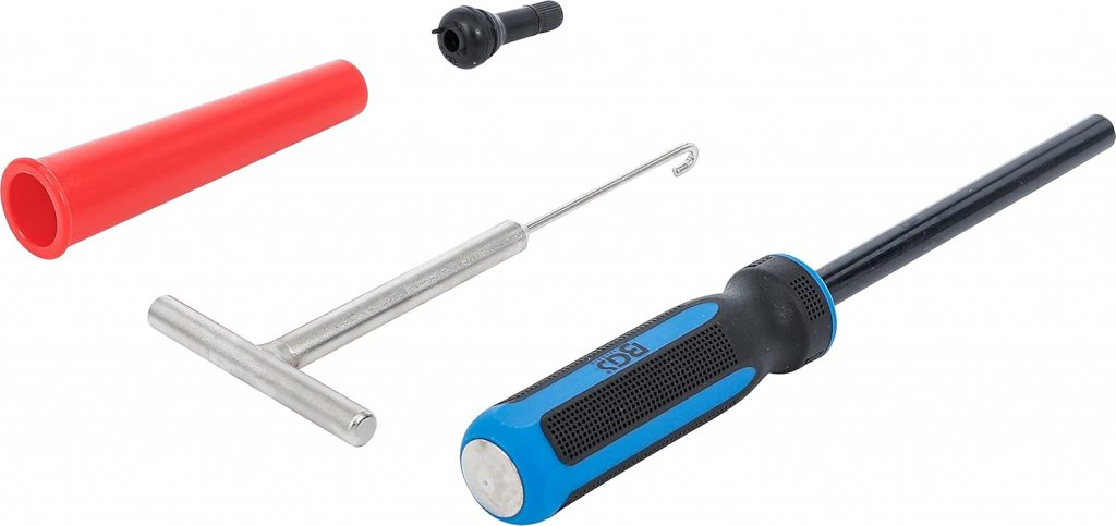 Med hjälp av setets komponenter – hakeverktyg, ventiltryckare, styrhylsa och en gummiventil – kan du enkelt installera eller justera ventiler med precision. Perfekt för både verkstad, servicefordon och hemmafixaren som vill arbeta professionellt.