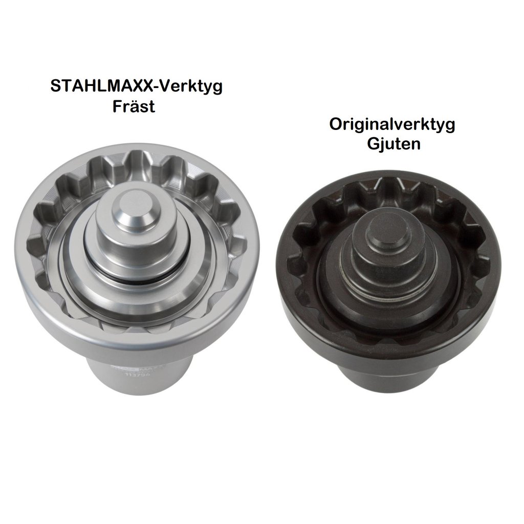 Denna precisionstillverkade specialhylsa är utvecklad för montering och demontering av hjulbultar med centrallås på Porsche 911-modeller. Verktyget är konstruerat i en ny, längre och fräst version som ger bättre åtkomst och minskar risken för skador på kaross och skärmar vid arbete runt hjulhusen.