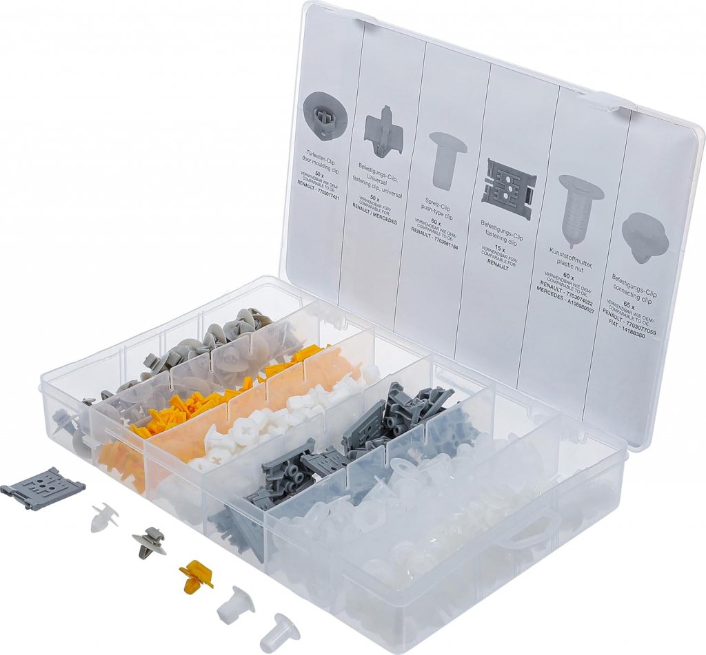 Denna omfattande clips-sats med 300 delar är särskilt framtagen för Renault och täcker de flesta behov vid montering och demontering av bilens interiör- och exteriördetaljer. Perfekt för arbete med paneler, dörrlister, klädsel och andra komponenter där korrekt infästning är avgörande.