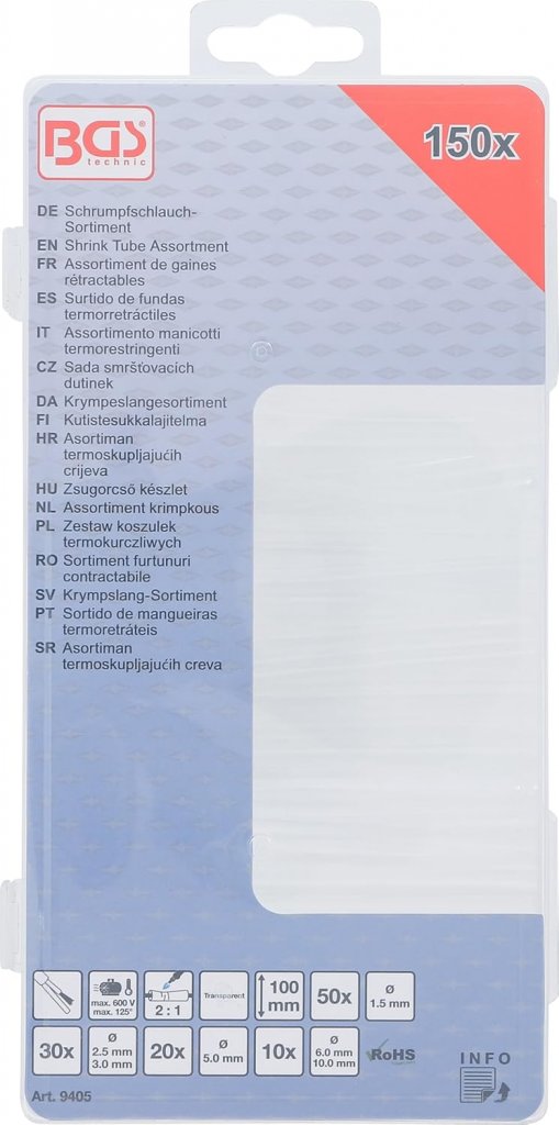Krympslang-sortiment i transparent med 150 delar för snabba reparationer, kabelskydd mot väder och korrosion. Leverans i praktisk sortimentslåda