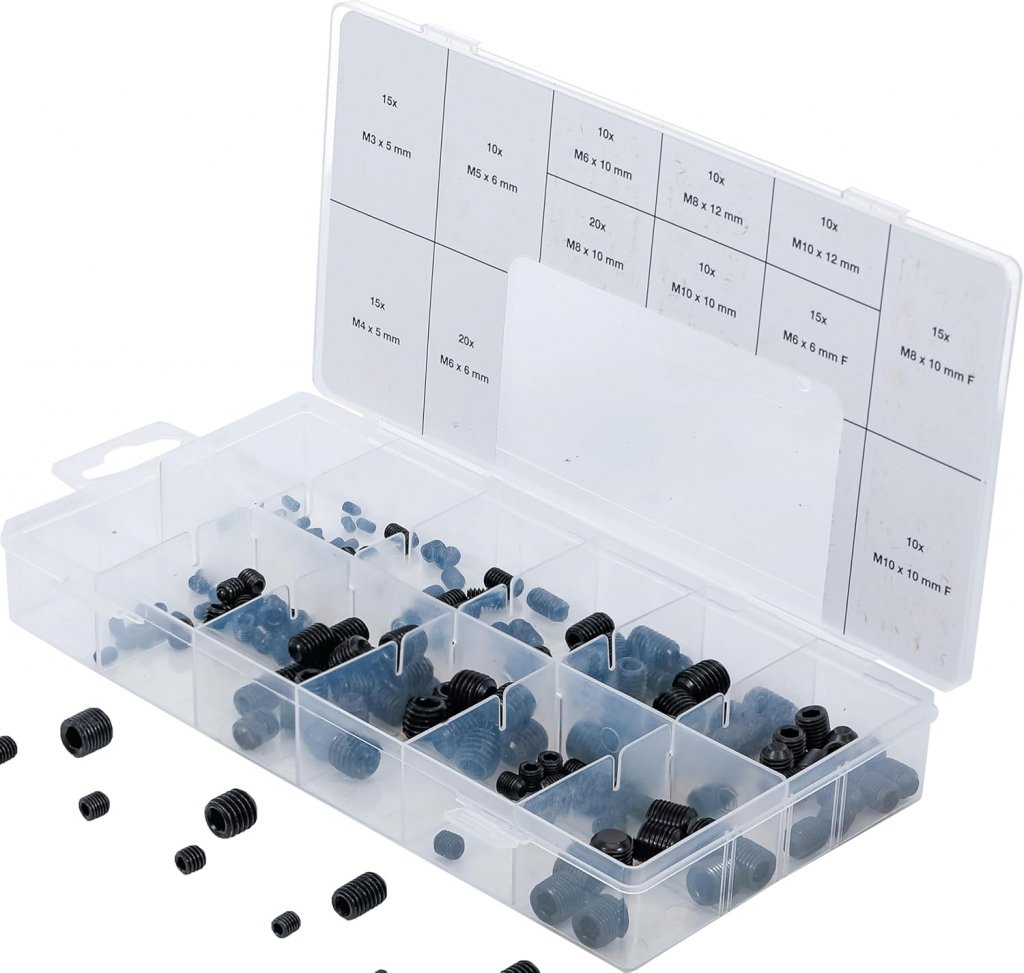 Detta stoppskruv-sortiment innehåller 160 delar i metriska dimensioner och är tillverkat enligt DIN 913-standard. Stoppskruvar, även kallade gängstift, används för att fixera komponenter utan att ett skruvhuvud sticker ut, vilket gör dem idealiska för precisionsapplikationer inom mekanik och maskinbyggnad.