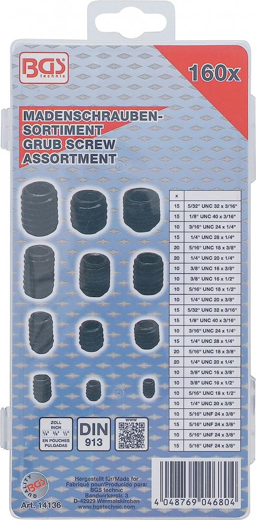 Detta stoppskruv-sortiment i tumstorlekar innehåller 160 delar och är tillverkat enligt DIN 913-standard. Stoppskruvar, även kallade gängstift, används för att fixera komponenter utan utstickande skruvhuvud och är idealiska för precisionsmontering inom mekanik och industri.