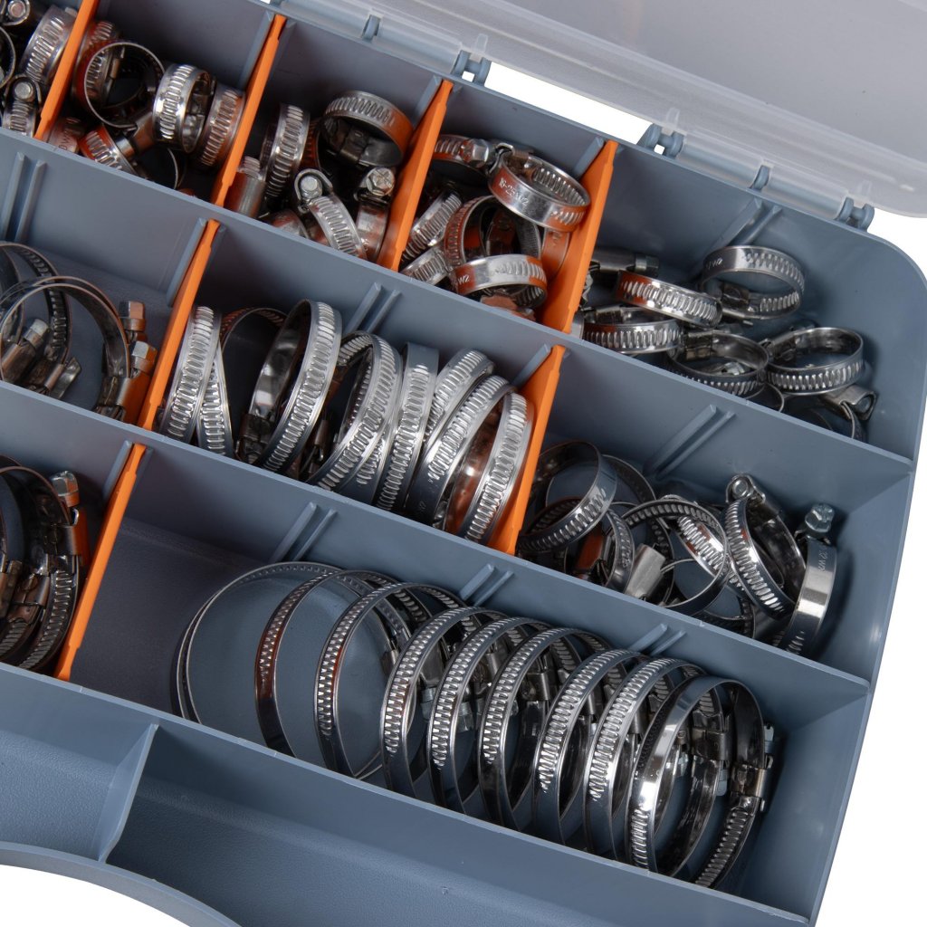 Detta kompletta slangklämmeset innehåller 110 delar i rostfritt stål W2, organiserade i en praktisk och överskådlig sortimentslåda. Med ett arbetsområde från 8 mm till 60 mm täcker setet de flesta behov inom fordonsservice, verkstad och industri.