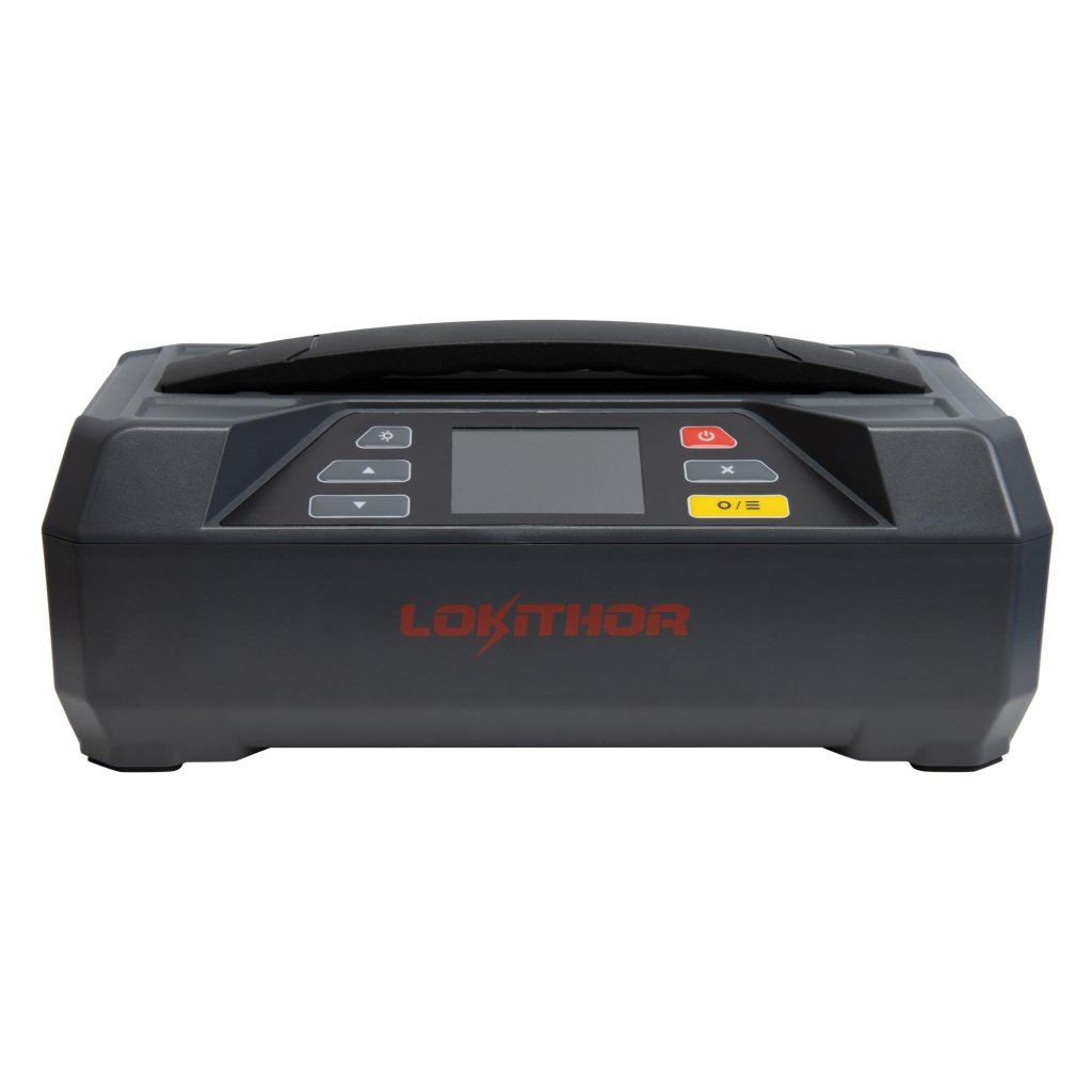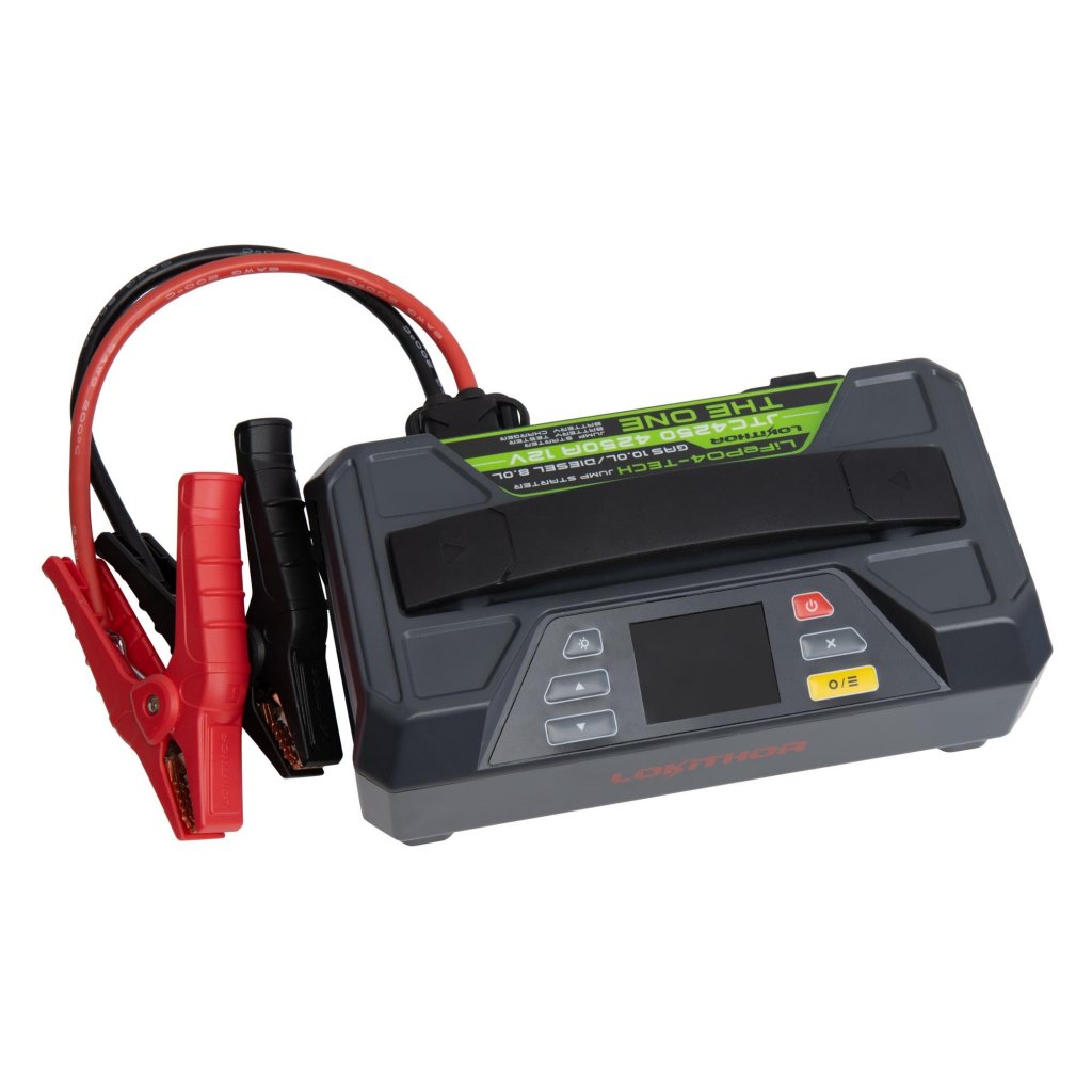LOKITHOR JTC4250 är en kraftfull starthjälp, en högkvalitativ batteriladdare, reaktiverings- och underhållsladdare, en batteritestare med startfunktion och laddningsspännings-/strömmätning, en powerbank, en spänningsomvandlare och ett arbets-, varnings- och positionsljus, allt i ett.
