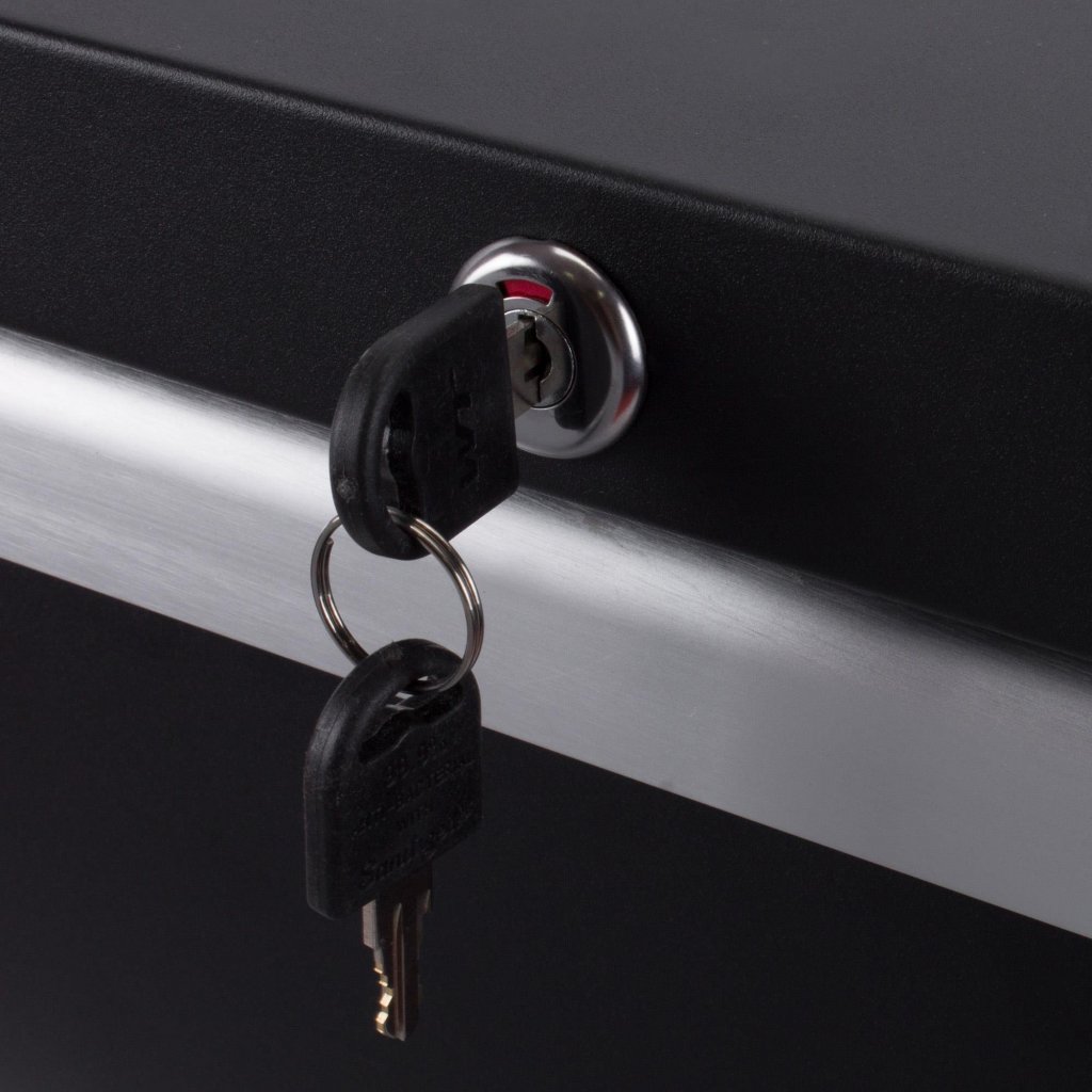 Den extra breda konstruktionen ger gott om arbetsutrymme och effektiv organisation av verktyg, maskiner och dokument – utan att kompromissa med stabilitet.