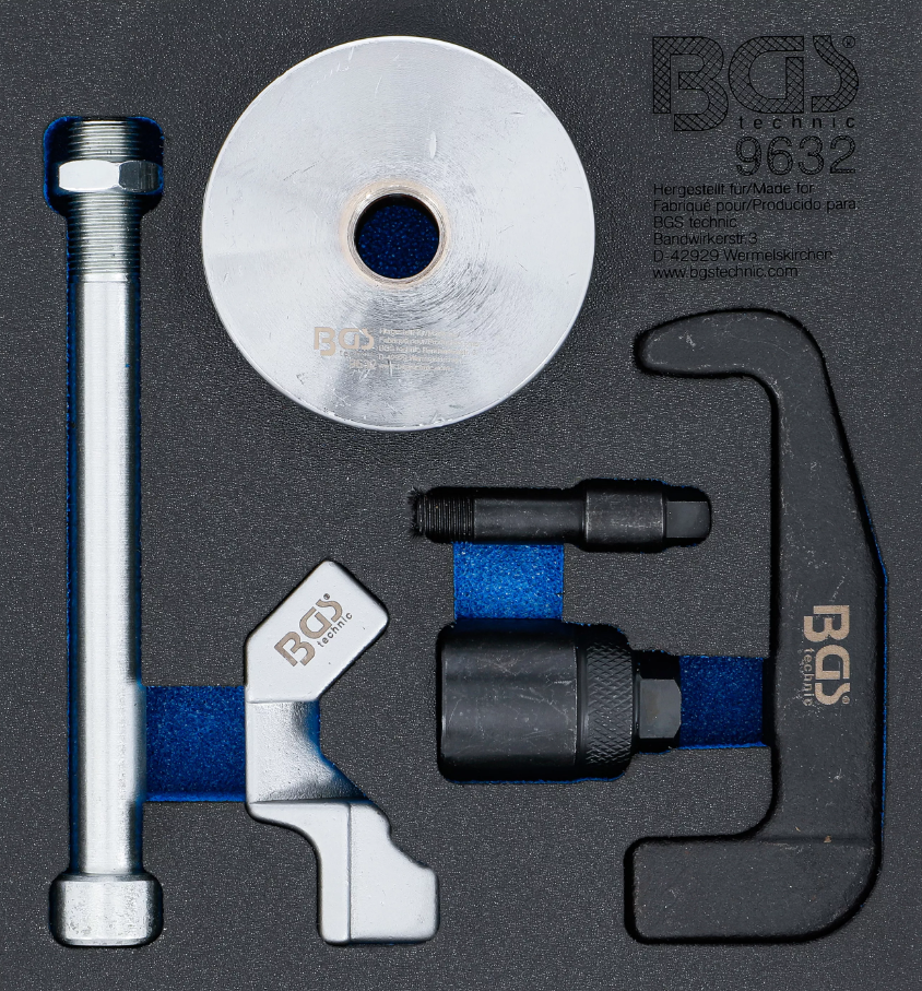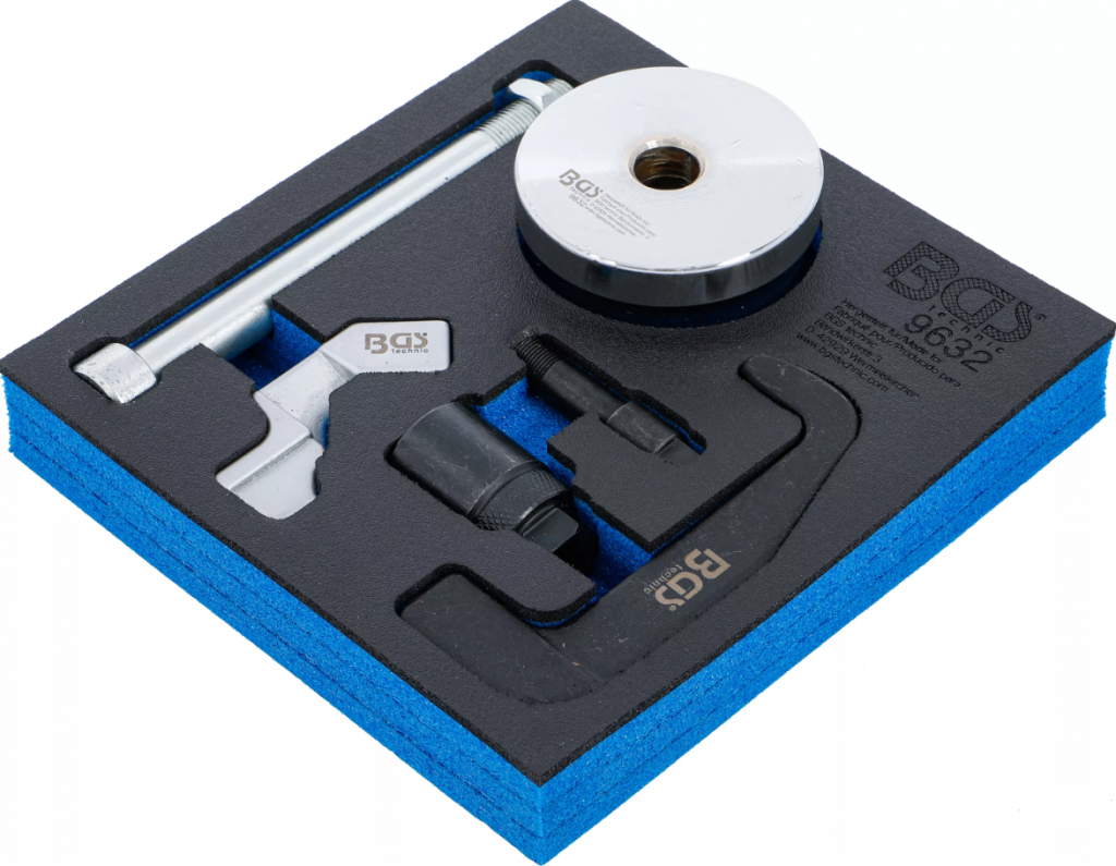 Verktyget levereras i en praktisk lådinsats av plastskum som passar perfekt i verktygsvagn eller BGS Box 16, vilket gör satsen enkel att organisera och transportera i verkstaden.