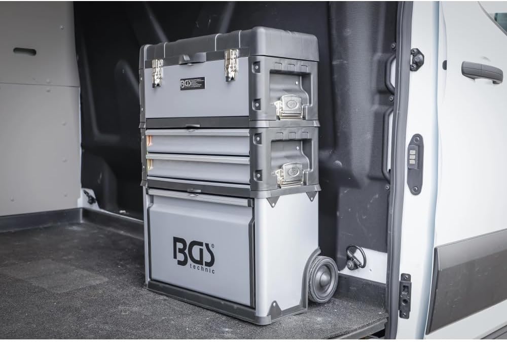 Den övre lådan är utrustad med klafflock och bärhandtag, den mellersta modulen erbjuder extra förvaringsutrymme och den nedre stora boxen med frontlock ger plats för större verktyg och maskiner. De övre modulerna kan låsas fast i boxen nedan, vilket ger säker transport och stabil hantering.