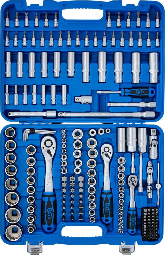 Med 192 delar erbjuder satsen en komplett uppsättning av hylsor, bitshylsor, spärrhandtag, kardanknutar och förlängare för 1/4", 3/8" och 1/2"-drivning. Den är särskilt lämpad för arbete med fordonsmotorer, maskiner och tekniska installationer, och inkluderar både standard- och djupa hylsor, E-hylsor, Torx- och insexbitar.