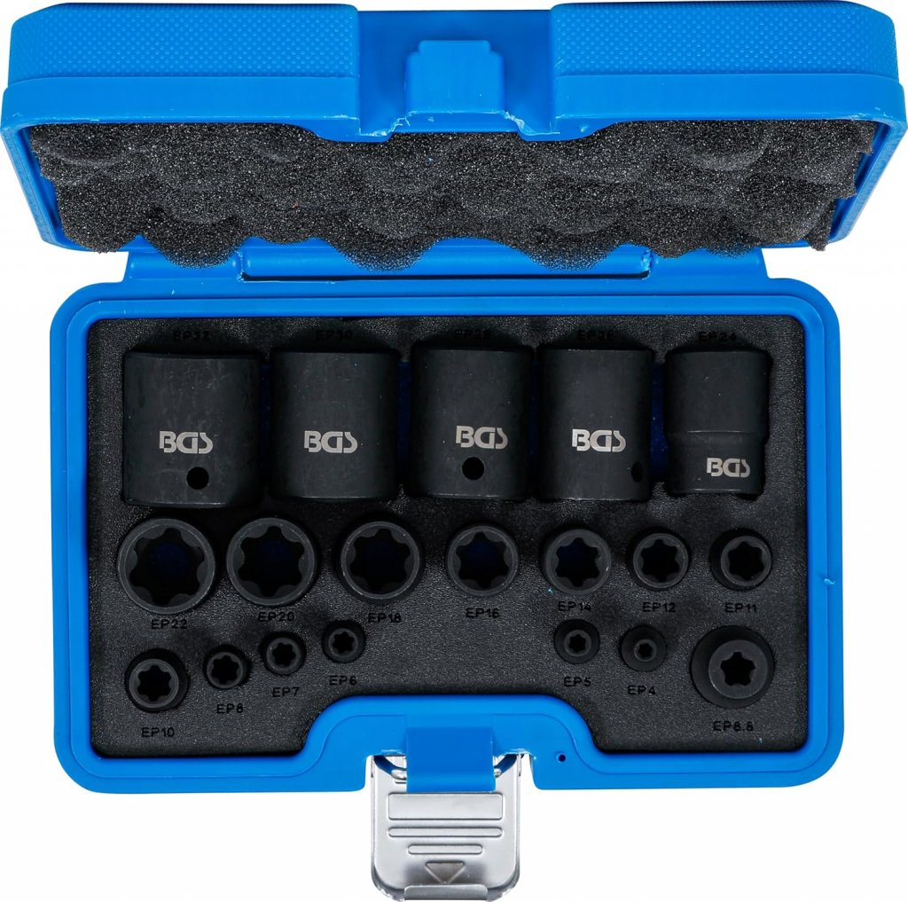 Professionell 19-delars krafthylssats med Torx Plus-profil (EP4–EP32), utvecklad för säker montering och demontering av 6-flanks Torx Plus-skruvar. Satsen är konstruerad för både manuell användning och maskinell drift med slagskruvdragare och lämpar sig för verkstad, industri och fordonsservice, inklusive arbete på Tesla och andra elbilar.