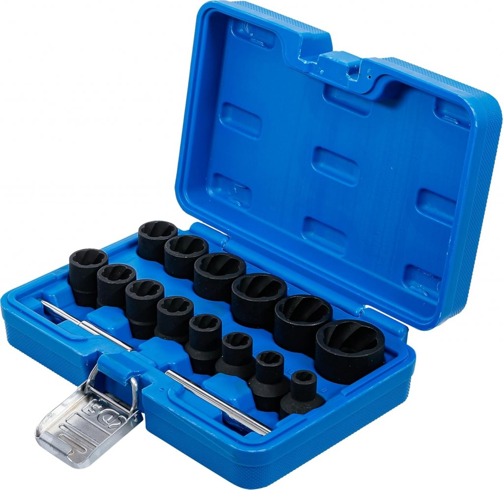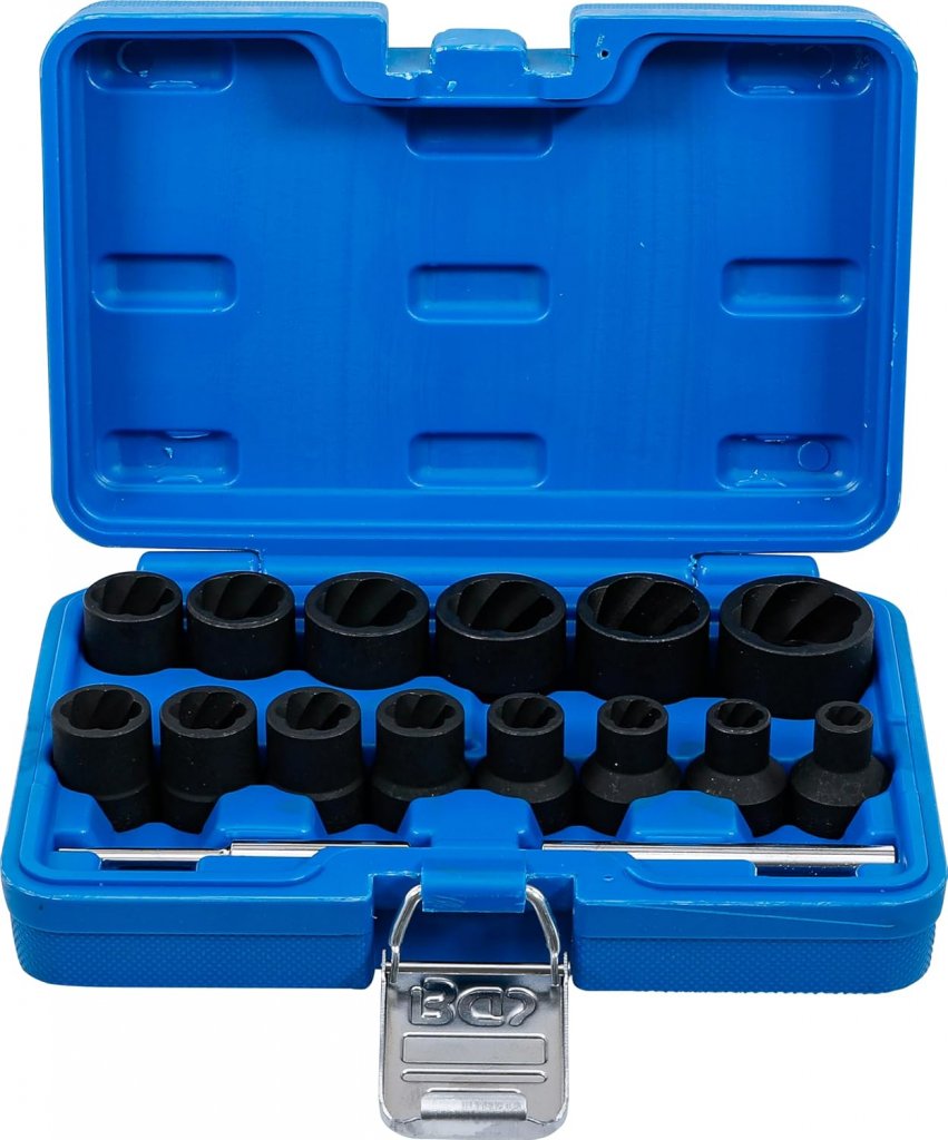 Denna bult- och mutteravdragarsats 1/2” är utvecklad för att effektivt lossa skadade, runddragna eller rostiga bultar och muttrar. Tack vare den innovativa spiralprofilen griper hylsorna aggressivt tag i fästelementet och möjliggör säker demontering även när traditionella hylsor misslyckas.