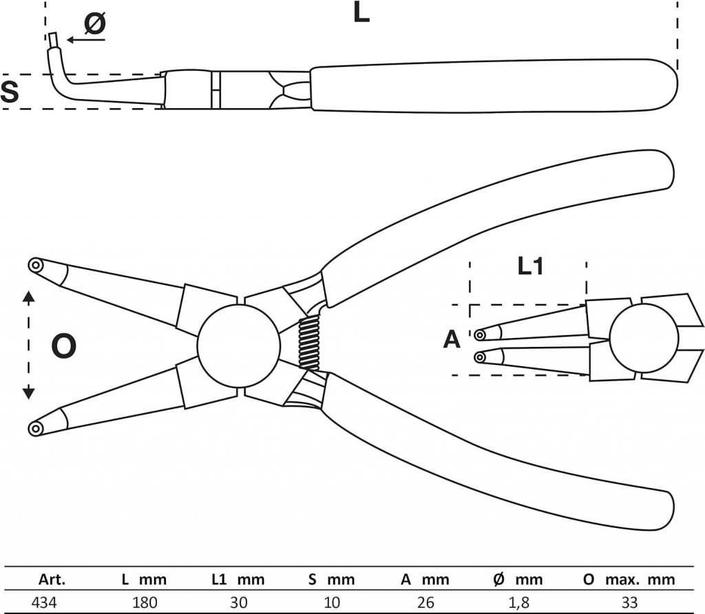 Låsringstång, böjd, för inre låsringar, 180 mm