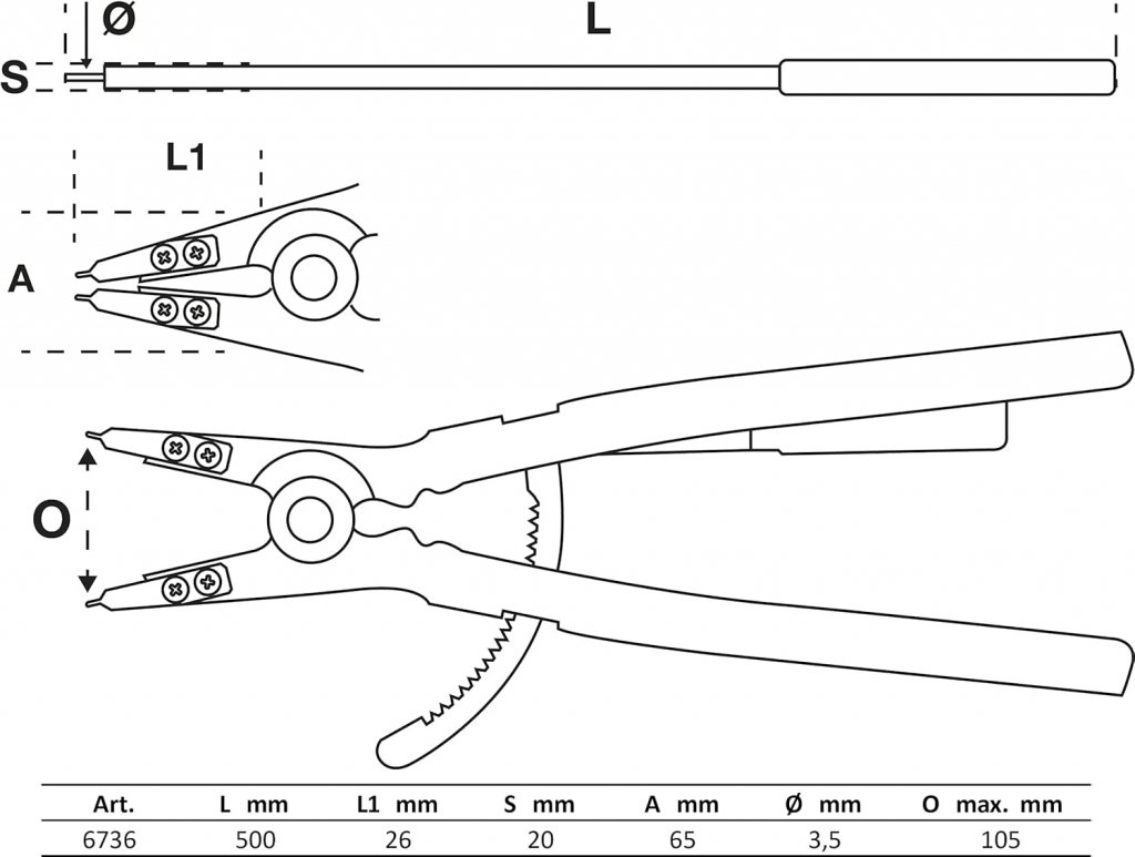 Låsringstång, rak, för yttre låsringar för lossning och fästning av låsringar