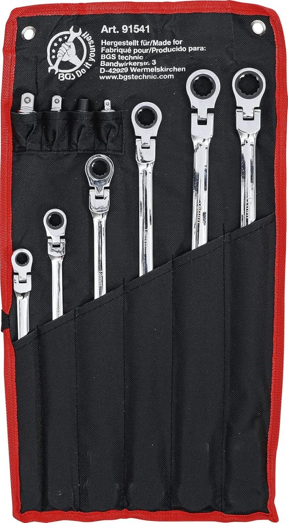 De fintandade spärrmekanismerna med 72 tänder möjliggör snabb och exakt rotation utan att ta bort nyckeln från muttern. Satsen levereras i en praktisk tetronupprullningspåse för enkel förvaring och transport.