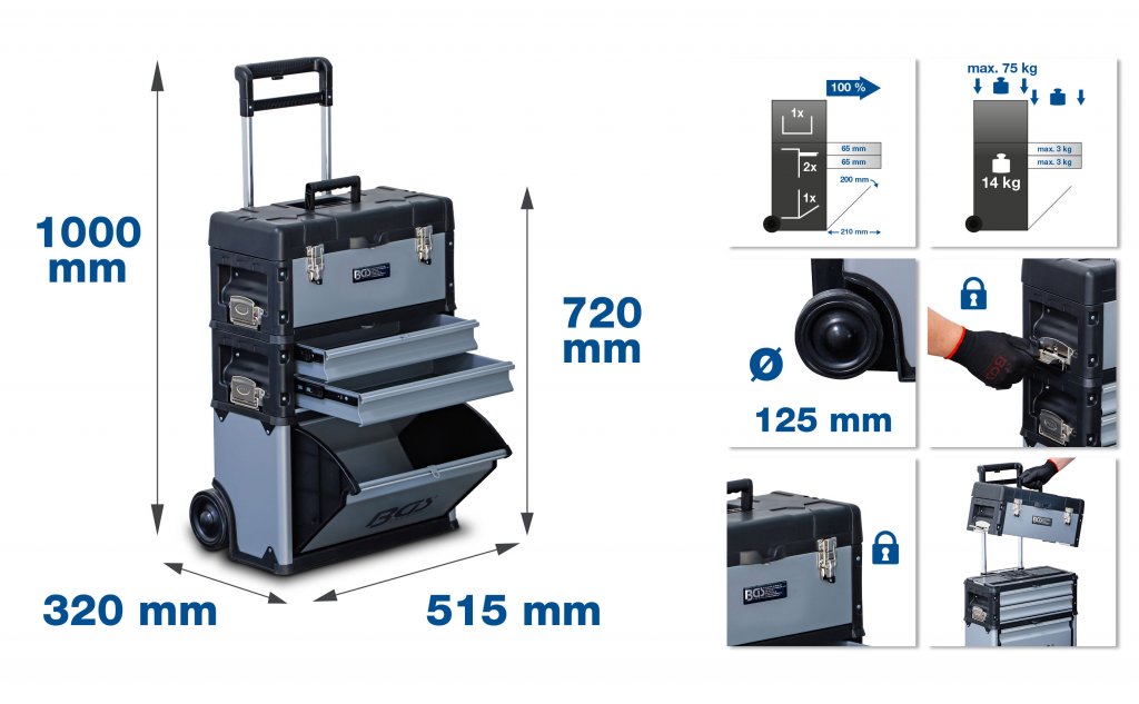 De enskilda verktygsväskorna kan stängas från sidan med två snäppen och ett bärhandtag av plast