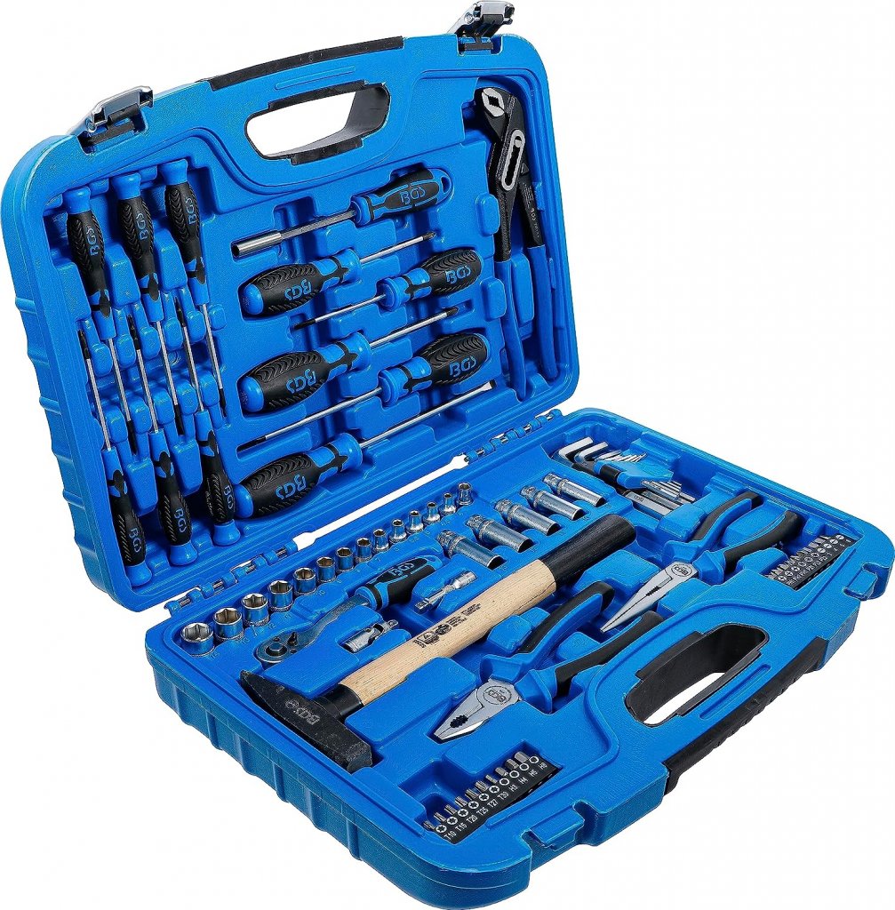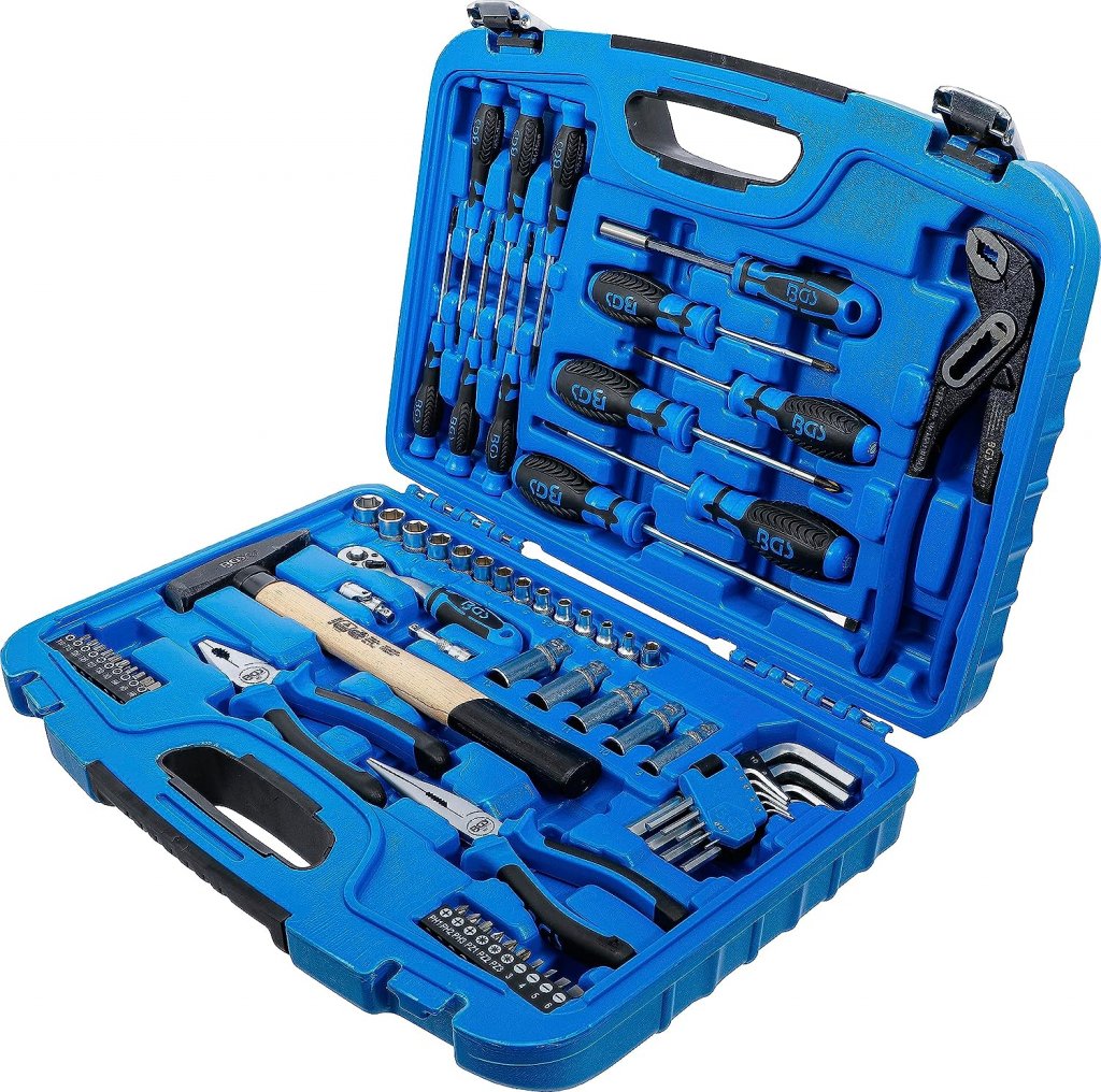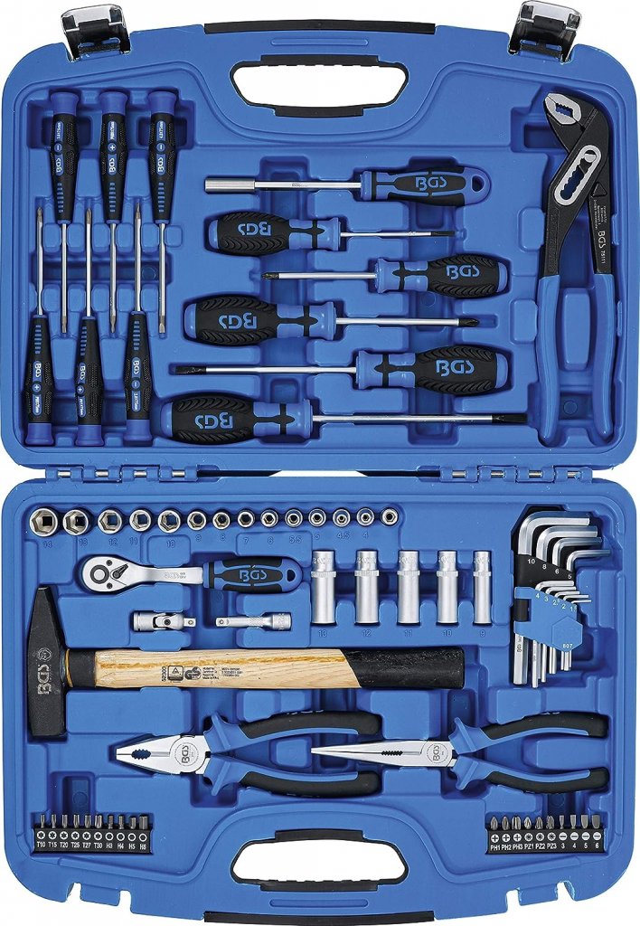 Denna verktygssats med 67 delar är ett komplett och kompakt verktygssortiment för verkstad, garage och servicebil. Satsen levereras i praktisk BGS systembox och innehåller allt du behöver för både professionella mekaniker och hemmafixare, från hylsor och bits till tänger, skruvmejslar och hammare.
