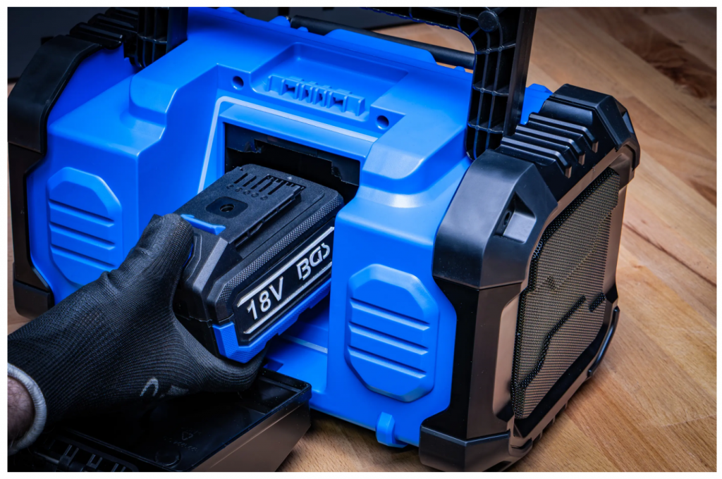 Den tåliga konstruktionen med IP65-klassning skyddar mot damm och vatten, vilket gör radion idealisk även i tuffa utomhusförhållanden. Kompatibel med BGS 18V-batterisystem (batteri och laddare säljs separat).