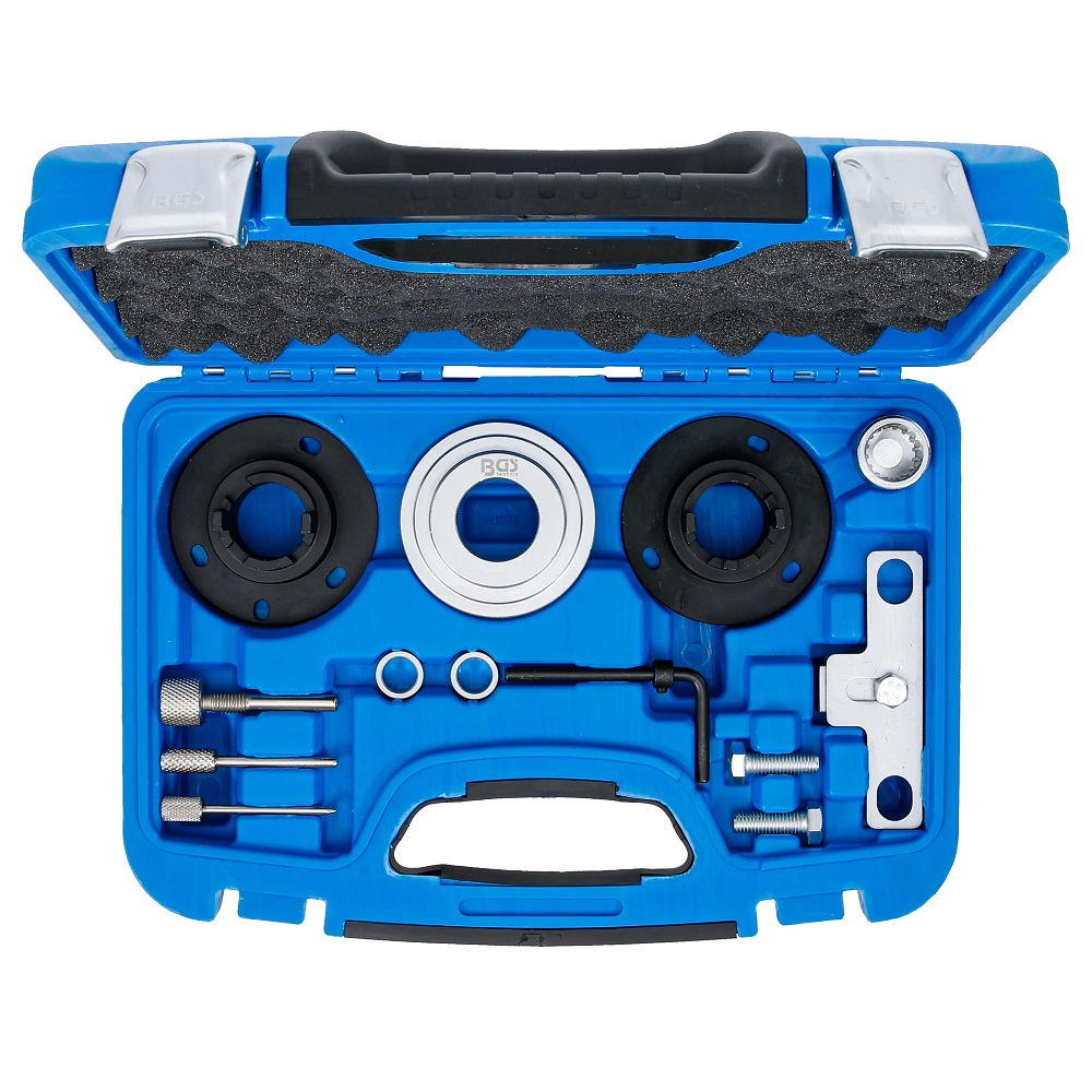 Verktygssatsen används vid service av kamkedjesystem och motorreparationer där exakt timing är avgörande. Den möjliggör säker låsning av vevaxeln, korrekt inställning av kamaxeljusterare samt stabil fixering av komponenter under arbete.