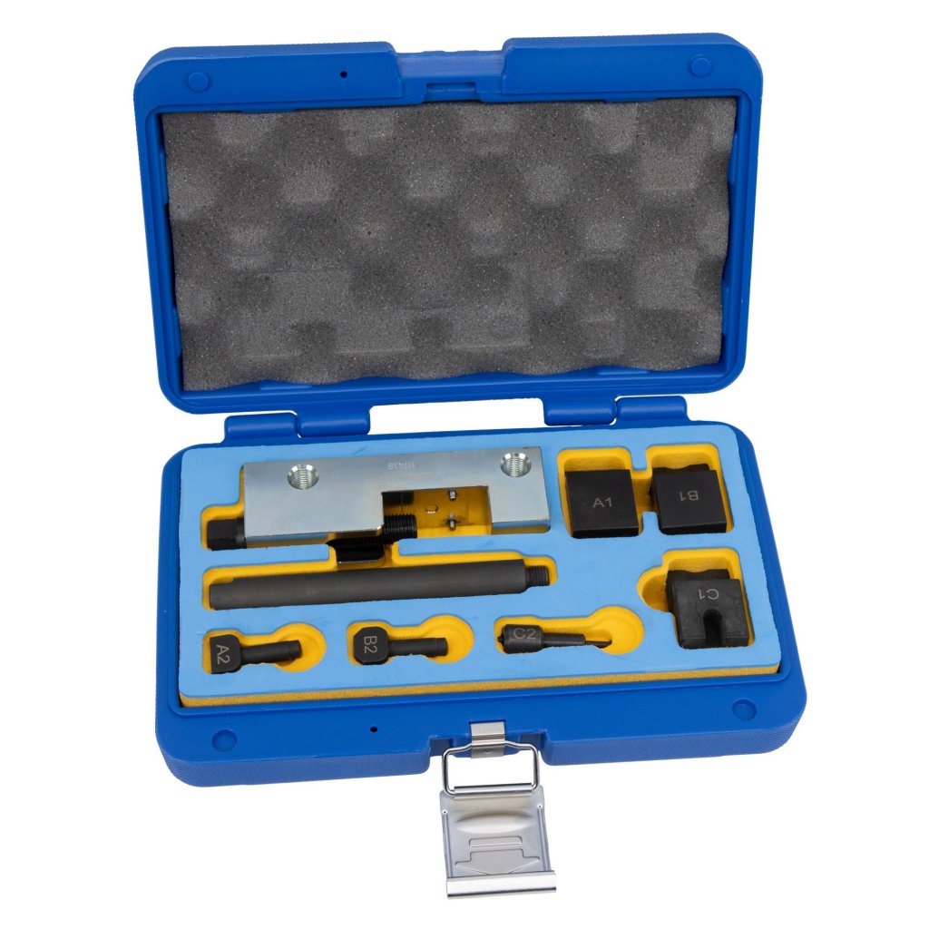 Konstruktionen och monteringspositionen för kamkedjan kräver ett specialanpassat verktyg, motsvarande Mercedes originalverktyg W276589003900. Vårt specialverktyg levereras komplett med flera komponenter, vilka listas nedan.