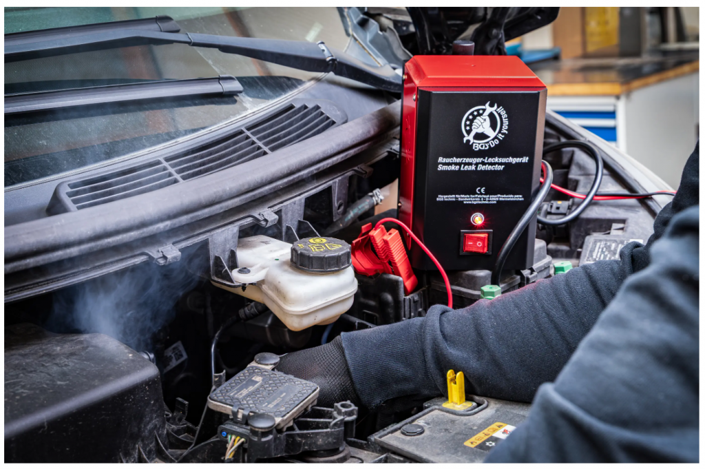 Fyll enheten med babyolja eller mineralolja (ingår ej), anslut till fordonets batteri och led in rök i systemet som ska testas. Läckor identifieras snabbt genom synlig rök som sipprar ut.