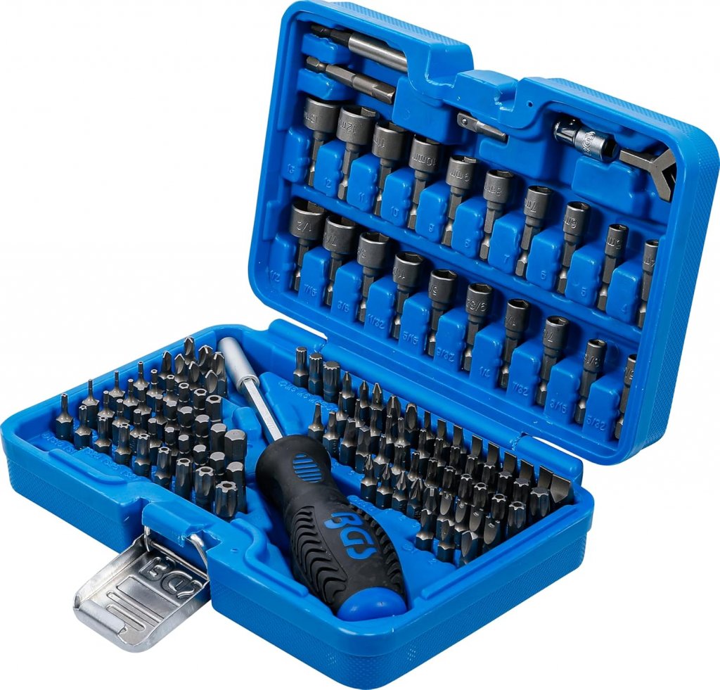 Universal Bitssats innehåller följande 122 delar som 200 mm vridhandtag med halkskyddsbeläggning, 121 bits och tillbehörsdelar för alla användningsändamål, bitshållare, krokvridare, 50 mm hylsadapter, 1/4" x 1/4" bitsadapter och 1/4" x 1/4" hylsadapter,